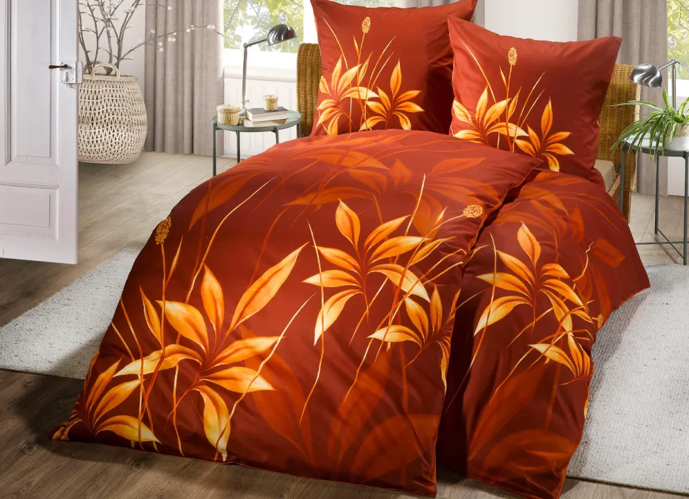 Ein schönes Blätter-Dessin in brillant leuchtenden Farben präsentiert sich auf der Vorderseite dieser digitalbedruckten Bettwäsche-Garnitur von Grund. Rückseite uni. Mit praktischem Reißverschluss ausgestattet. Die Qualität: Renforcé aus 100% Baumwolle. Waschbar bis 60 °C und trocknergeeignet