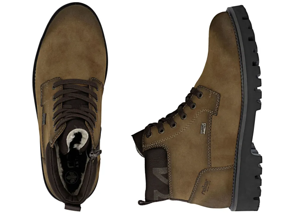 Rieker, gefütterte Herren-Boots, Winterschuhe, Weite H, mit Reißverschluss in Cognac und in Größe 46.