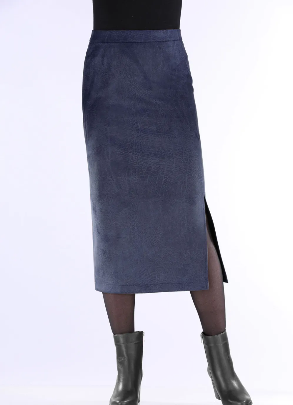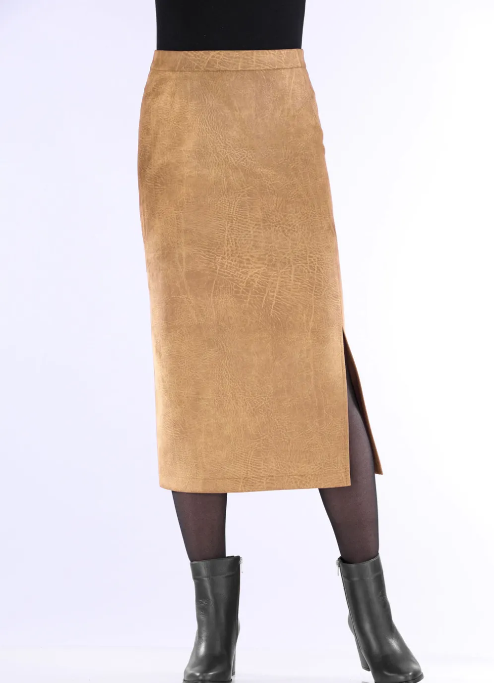 Attraktiver Rock in samtweicher Wildleder-Opitk, schmaler Schnittführung und bequemer Schlupfform: glatt anliegender Rundum-Dehnbund sowie seitlicher Schlitz. Länge ab Taille ca. 76 cm, bei K-Gr. ca. 72 cm. Ungefüttert