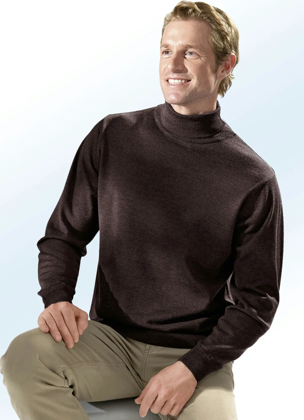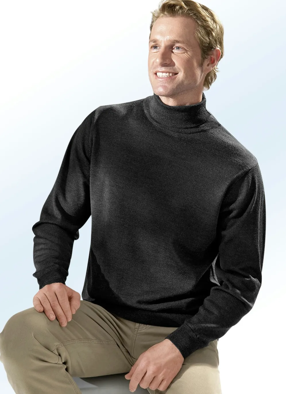 Rollkragenpullover in 3 Farben mit Rippenstrick-Abschlüssen in Schwarz und in Größe 46.