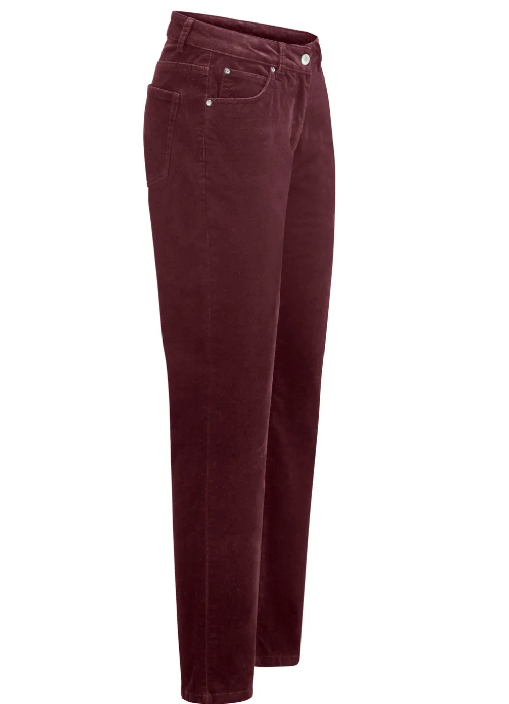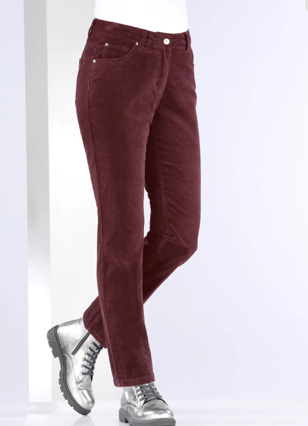 Samtweiche Hose in 5-Pocket-Form in Bordeaux und in Größe 34.