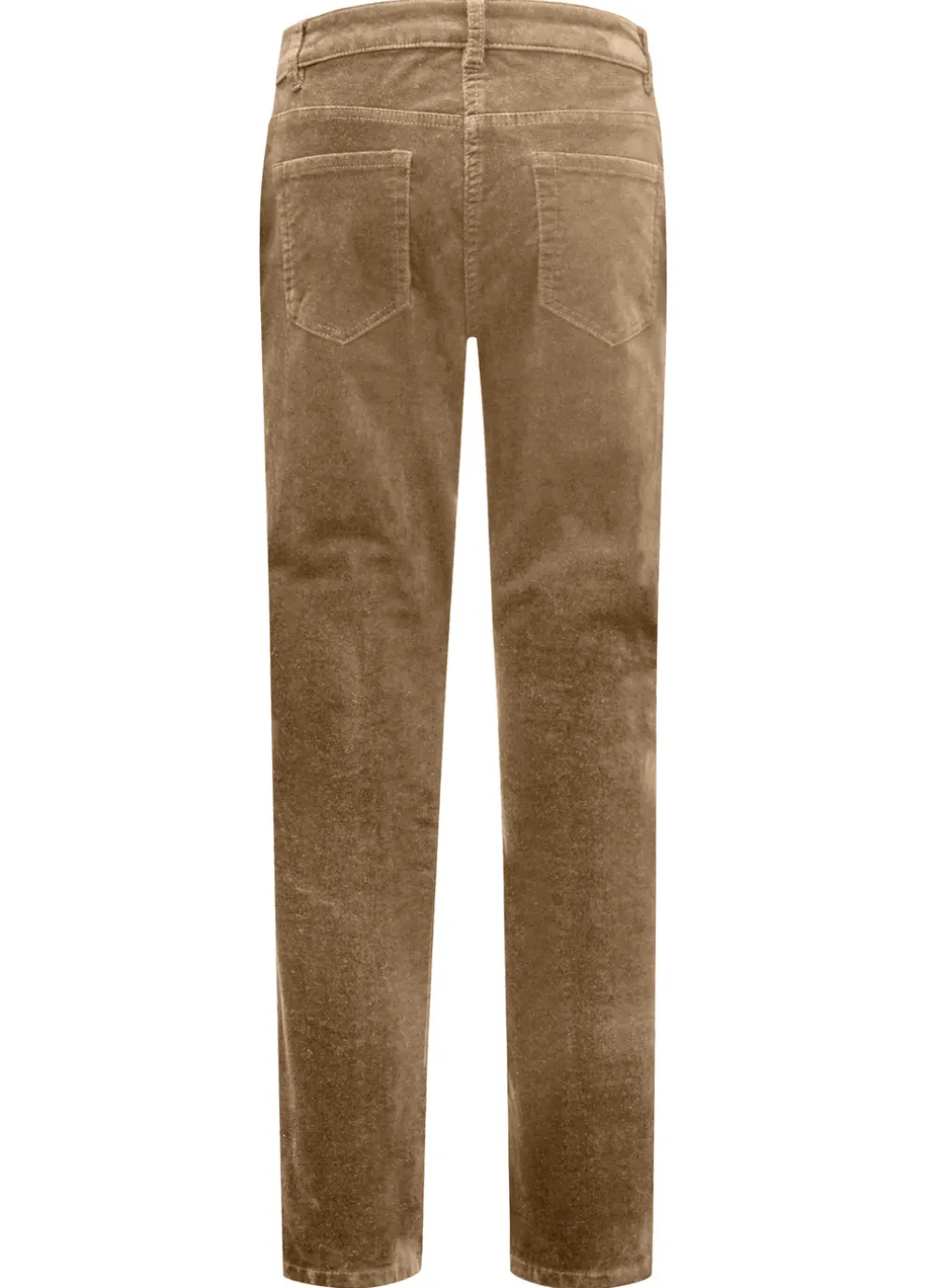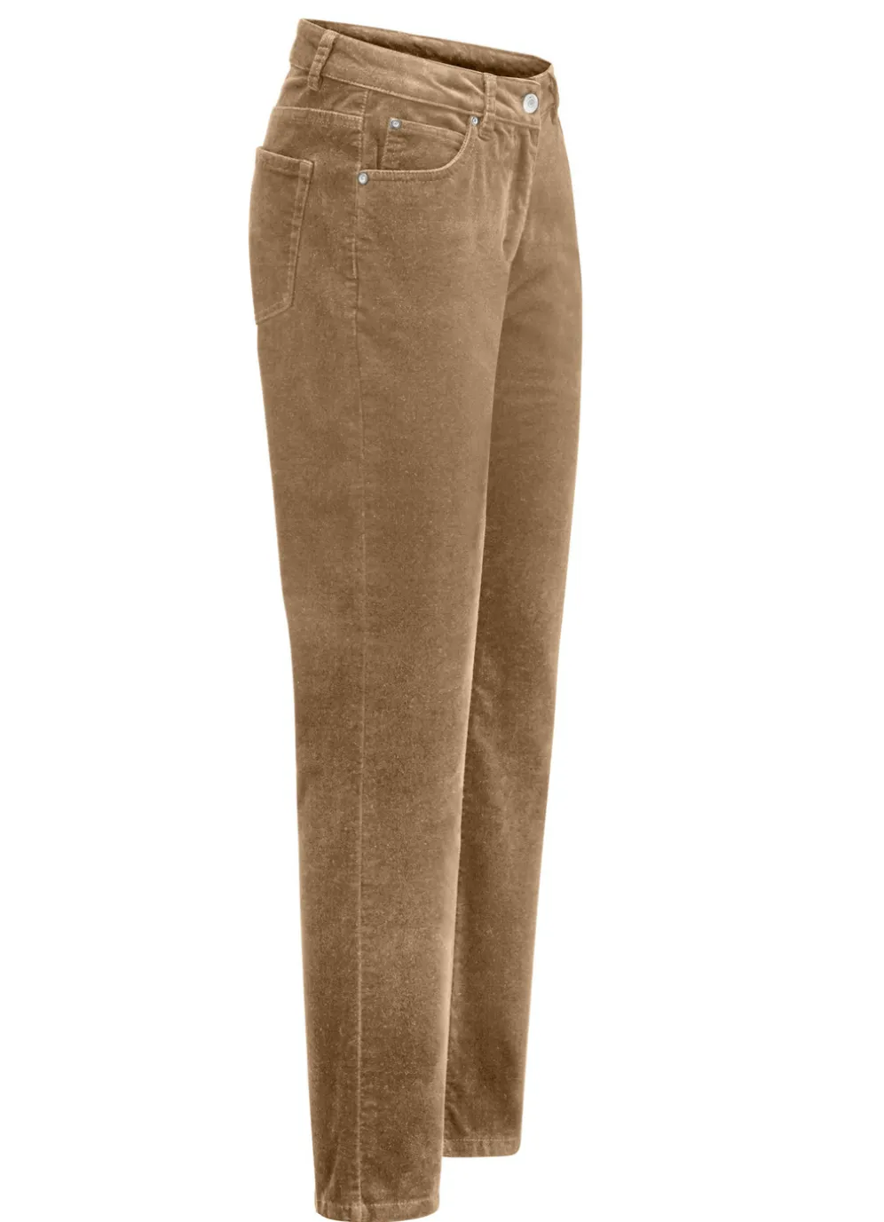Samtweiche Velvet-Hose in 5-Pocket-Form: elastischer Formbund, Gürtelschlaufen, Knopf- und Reißverschluss sowie figurformende Passe im Rückteil. Innenbeinlänge ca. 77 cm, Fußweite ab 32 cm.