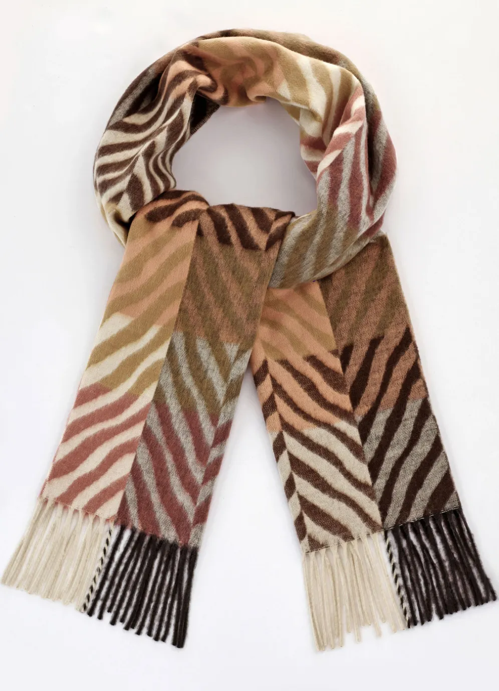 Ansprechender Schal mit Fantasiedessin in Schokobraun-Cognac-Beige-Mango sowie gedrehten Fransen an den Enden. Maße: 180×30 cm Die Qualität: Jacquardgewebe aus 100% Polyacryl MIG Logo