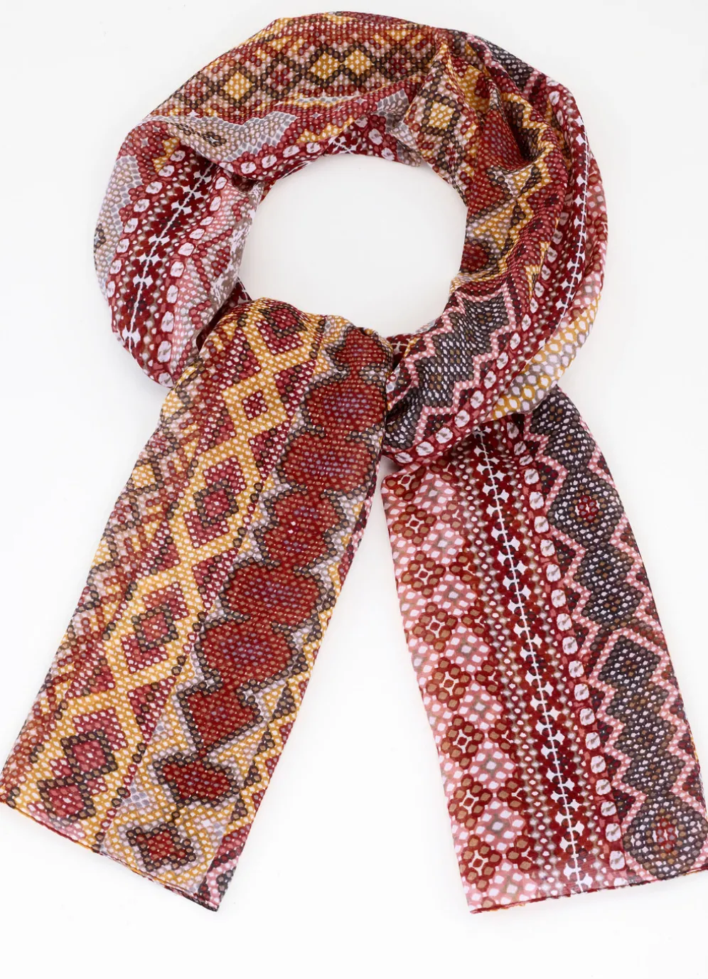 Interessanter Schal mit Fantasiedessin in Ziegelrot-Safran-Rosenholz-Sand-Schwarz auf weißem Fond. Maße: 180×50 cm