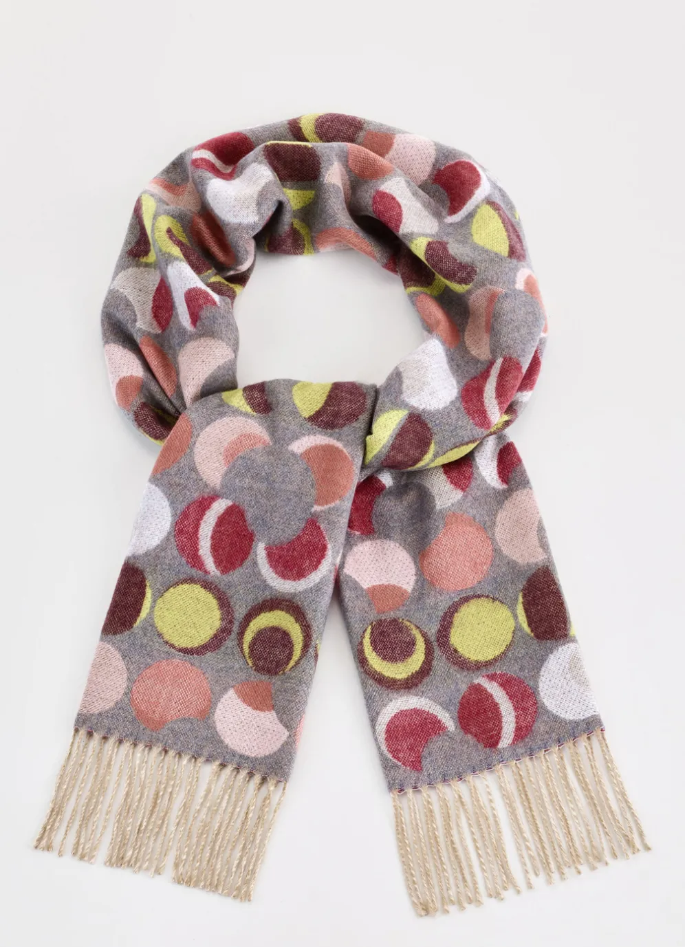 Schal mit Fantasiedessin in Grau-Burgund-Limette-Puder.