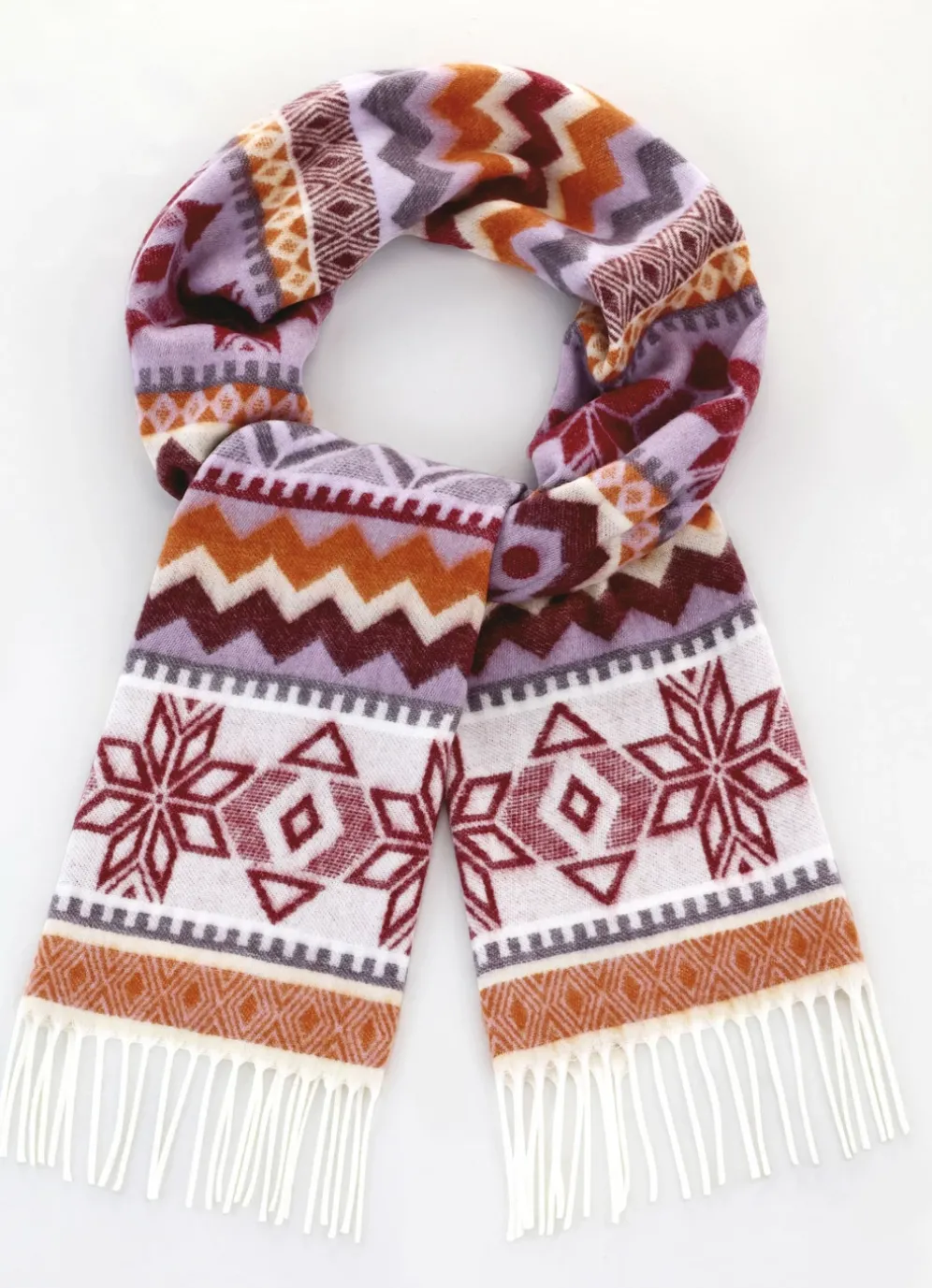 Flauschig weicher Schal mit grafischem Dessin in Ecru-Violett-Orange-Bordeaux sowie gedrehten Fransen an den Enden. Maße: 180×30 cm