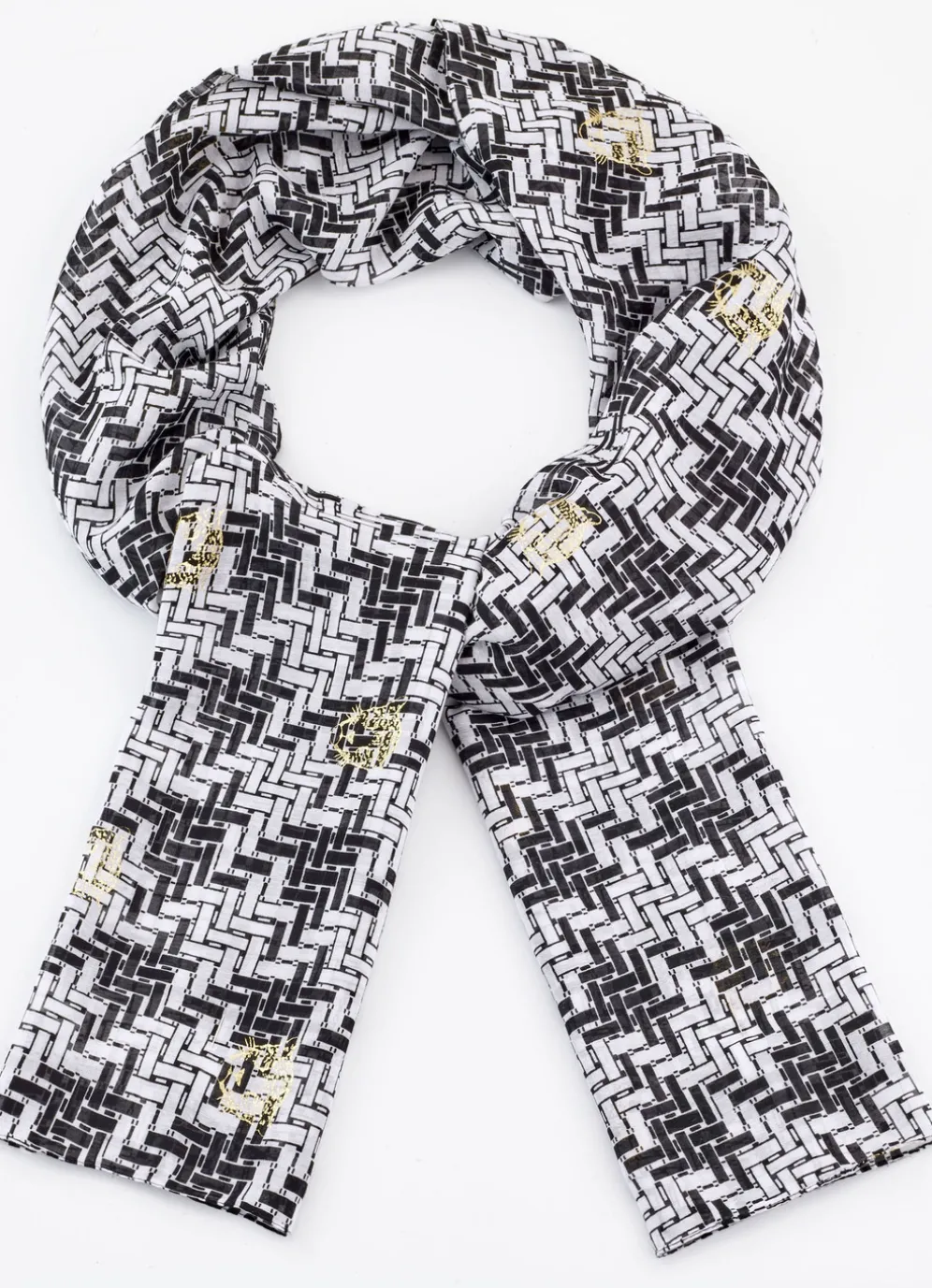 Duftiger Schal in Creme-Schwarz mit grafischem Dessin. Dezente, goldfarbene Tigerkopf-Motive ergänzen den Look perfekt. Maße: 180×50 cm