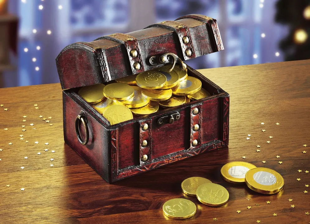 Schöne Truhe aus Holz und Metall, gefüllt mit „Euro“- Münzen aus feiner Schokolade. Die Truhe kann auch beliebig für andere Kostbarkeiten verwendet werden! Maße: B15xH11xT10 cm. Inhalt: 150 g