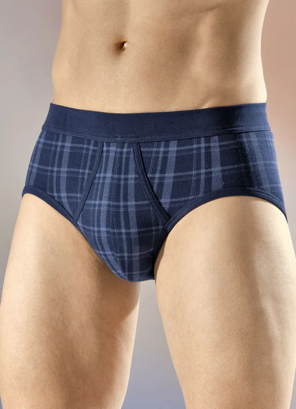 „Schiesser“-Slip in Marine, mit Karodessin, Label am Softbund sowie paspeliertem Eingriff.