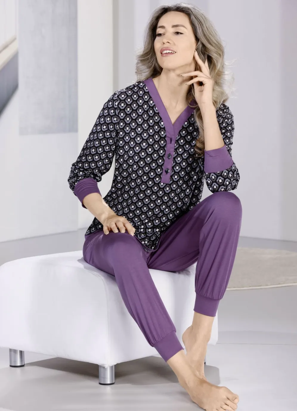 Umwerfender Schlafanzug in Pflaume-Schwarz-Bunt, mit Bündchenabschlüssen. Oberteil mit