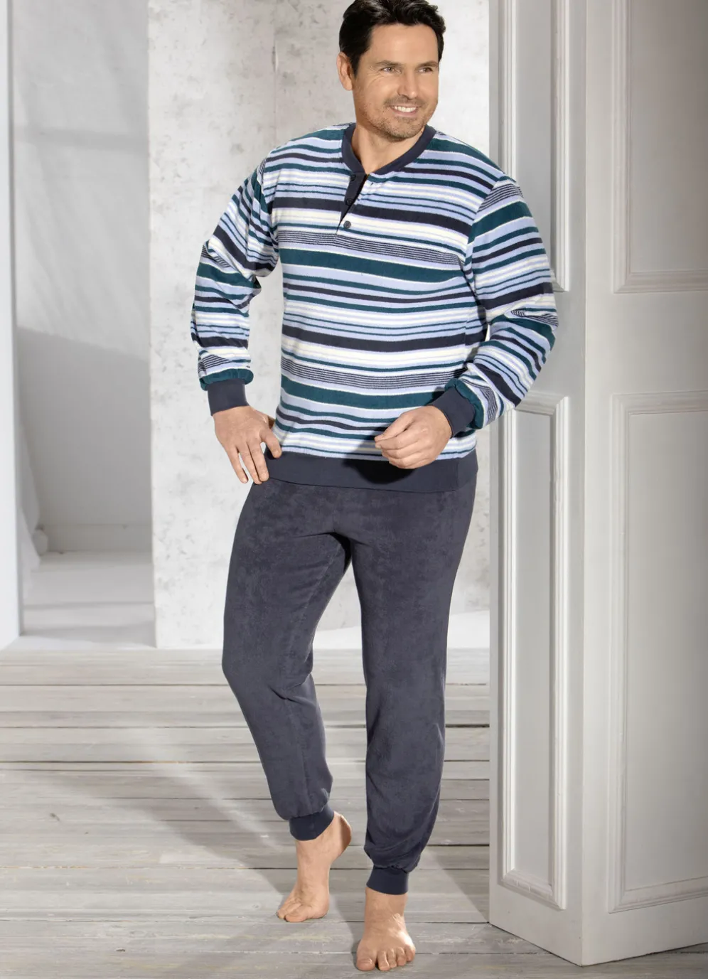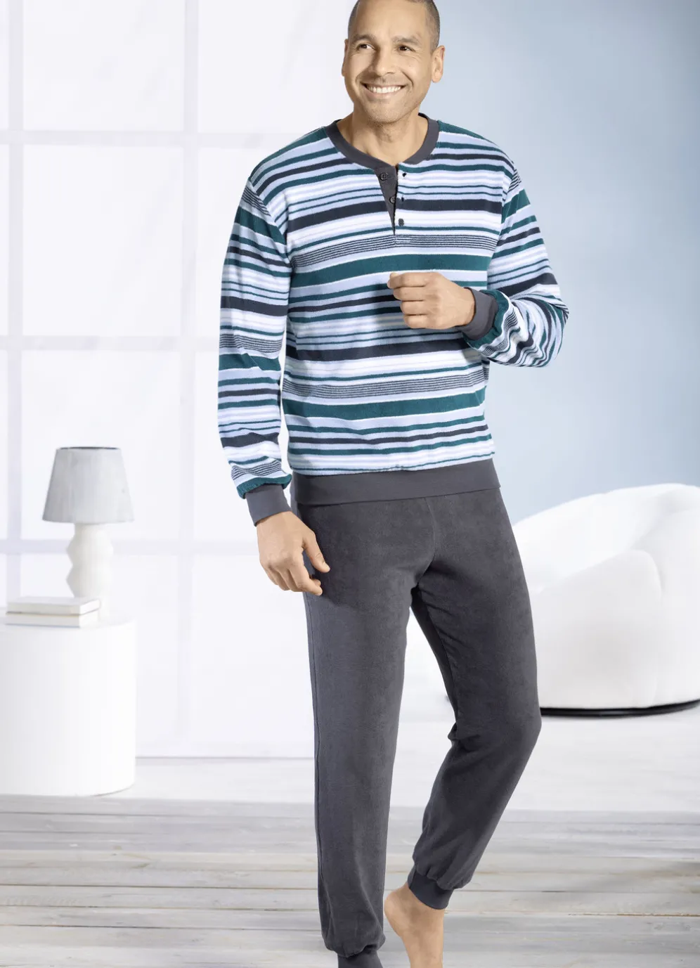 Kuscheliger Schlafanzug mit Bündchenabschlüssen! Das Oberteil mit Knopfleiste zeigt ein garngefärbtes Ringeldessin in Petrol-Grafit-Bleu. Dazu passt die lange, grafitfarbene Hose mit auswechselbarem