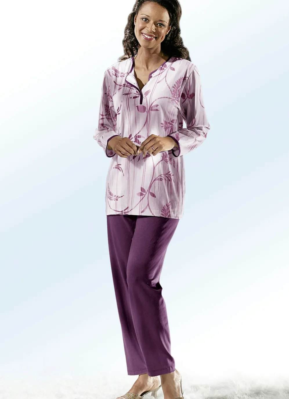 Schöner Schlafanzug: länger geschnittenes, allover dessiniertes Oberteil mit uni Einfassung am Halsausschnitt, entlang der Knopfleiste und an den Ärmelabschlüssen. Es wird ergänzt von der langen, Hose mit Dehnbund sowie offenen Beinabschlüssen.
