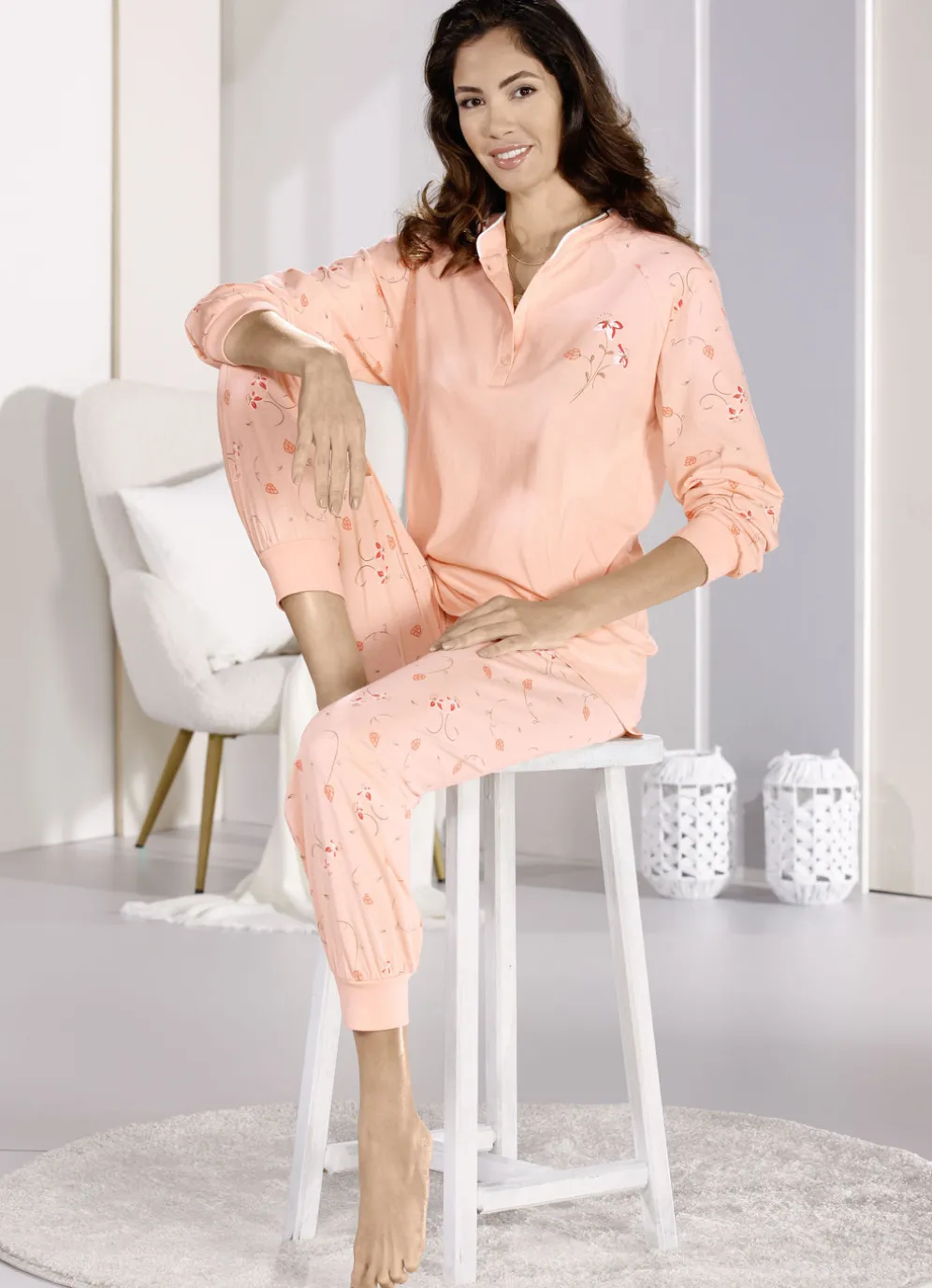 Traumhafter Schlafanzug: Oberteil mit Kontrastpaspel am Stehkragen, Knopfleiste sowie platziertem Druck vorne. Die langen Ärmel mit Bündchen und die Schultereinsätze zeigen den gleichen Alloverdruck wie die lange Hose mit Dehnbund und Bündchenabschlüssen.