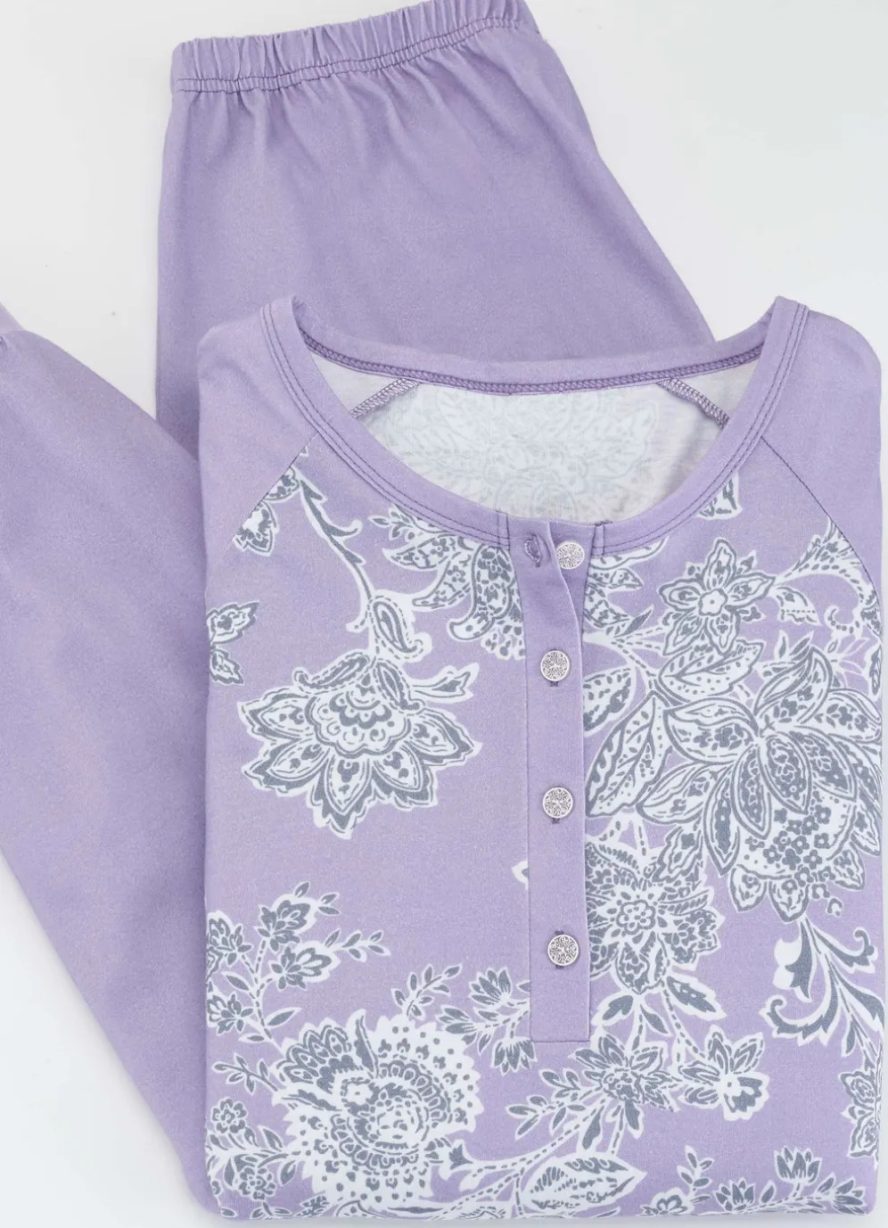 Hübscher Schlafanzug mit Bündchenabschlüssen! Dessiniertes Oberteil mit uni Einfassung am Halsausschnitt, Knopfleiste sowie Schultereinsätzen. Lange Hose mit Dehnbund.