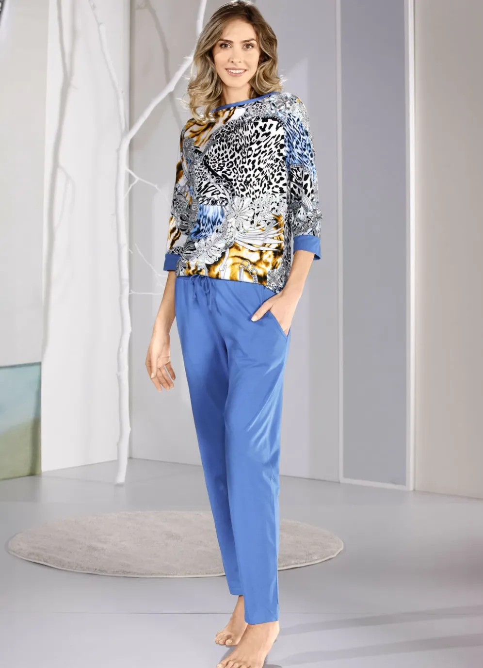 Blendenabschlüssen an den 3/4-langen Ärmeln. Lange Hose mit Kordel–