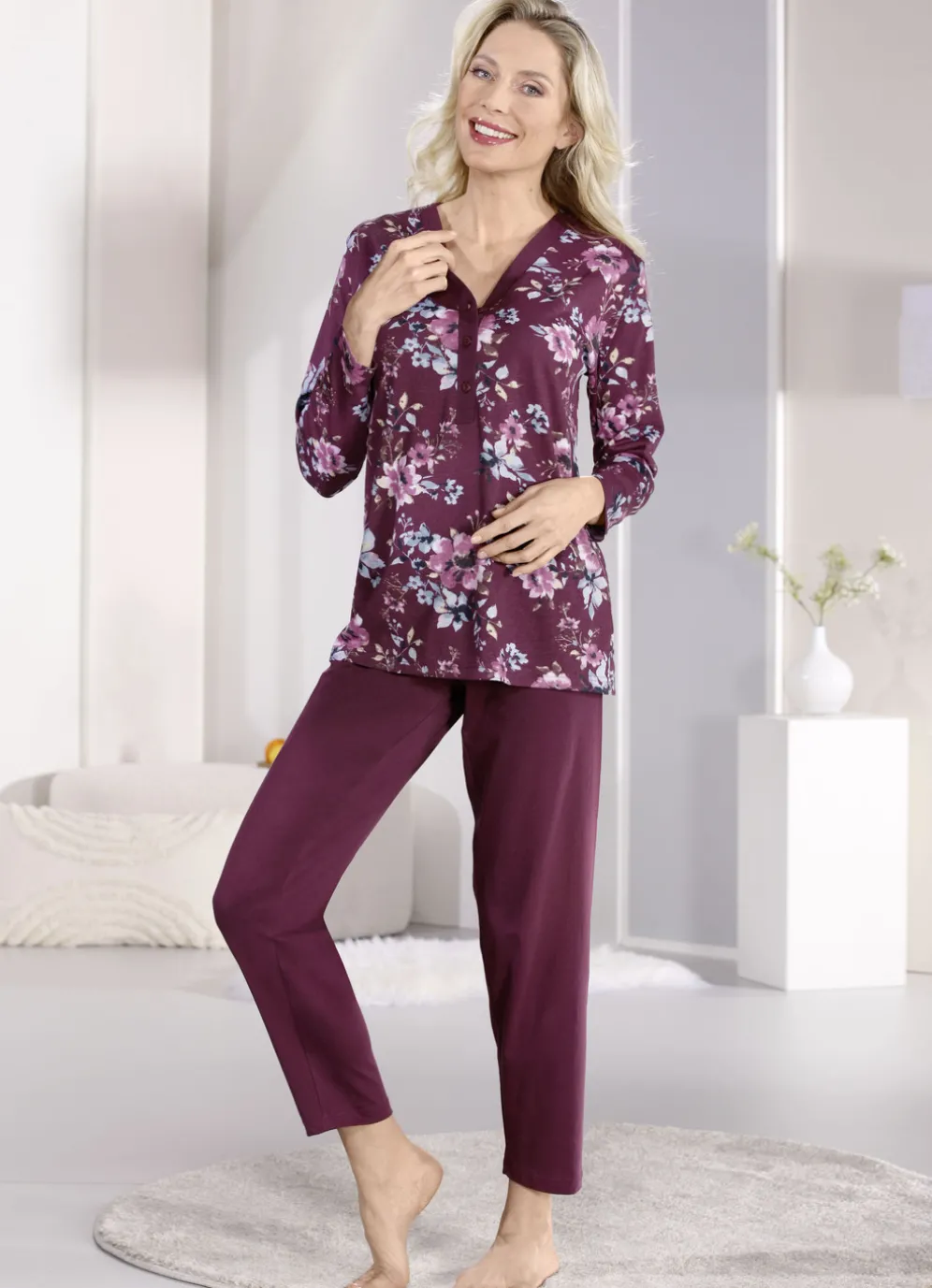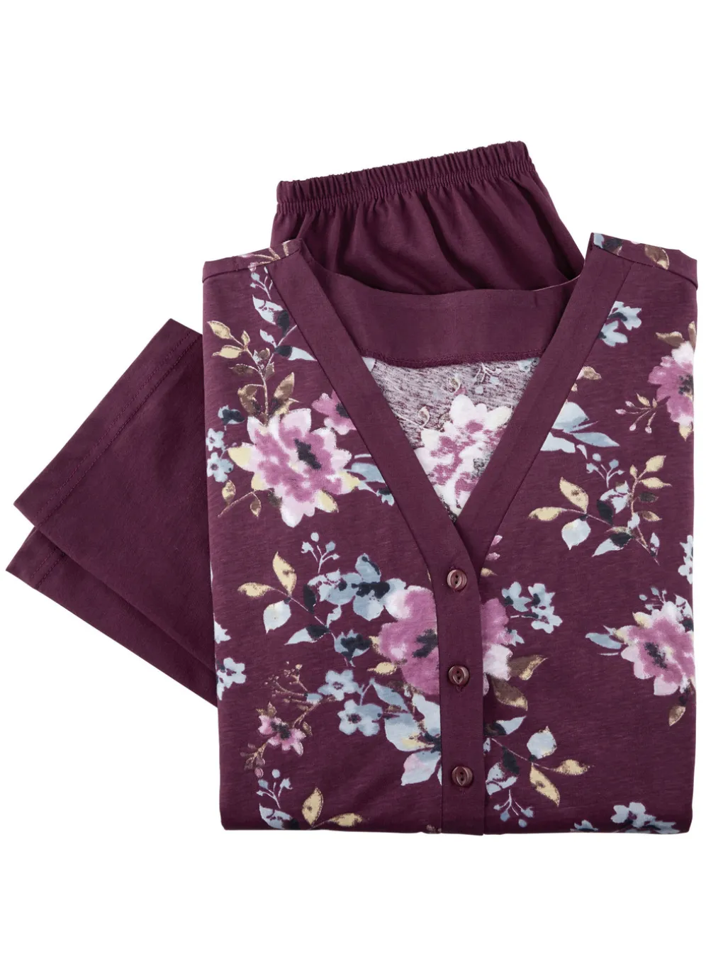 Schlafanzug mit Blende und Knopfleiste sowie langen Ärmeln in Bordeaux-Beere-Bunt und in Größe 38.