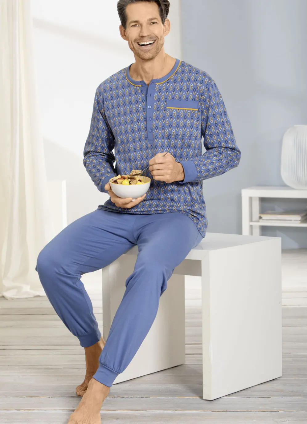 Einfach klasse ist dieser jeansblaue Schlafanzug: Oberteil mit safran-marine-bleu dessiniertem Alloverdruck, Knopfleiste, aufgesetzter Brusttasche und Ärmelbündchen. Lange Hose mit auswechselbarem Gummizug im Bund sowie Bündchenabschlüssen.