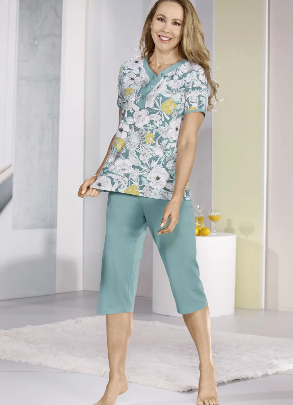 Toller Schlafanzug in Jade-Bunt! Oberteil mit Blende, V-Ausschnitt, Knopfleiste sowie kurzen Ärmeln mit Einfassung. Dazu die wadenlange Hose mit Dehnbund und offenen Beinabschlüssen.