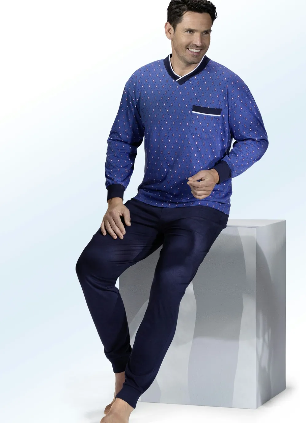 Dieser herrliche Schlafanzug lädt zum Träumen ein! Das allover in Blau-Marine dessinierte Oberteil ist mit V-Ausschnitt, aufgesetzter Brusttasche sowie Ärmelbündchen gearbeitet. Lange, marinefarbene Hose mit auswechselbarem Gummizug im Bund und Bündchenabschlüssen.