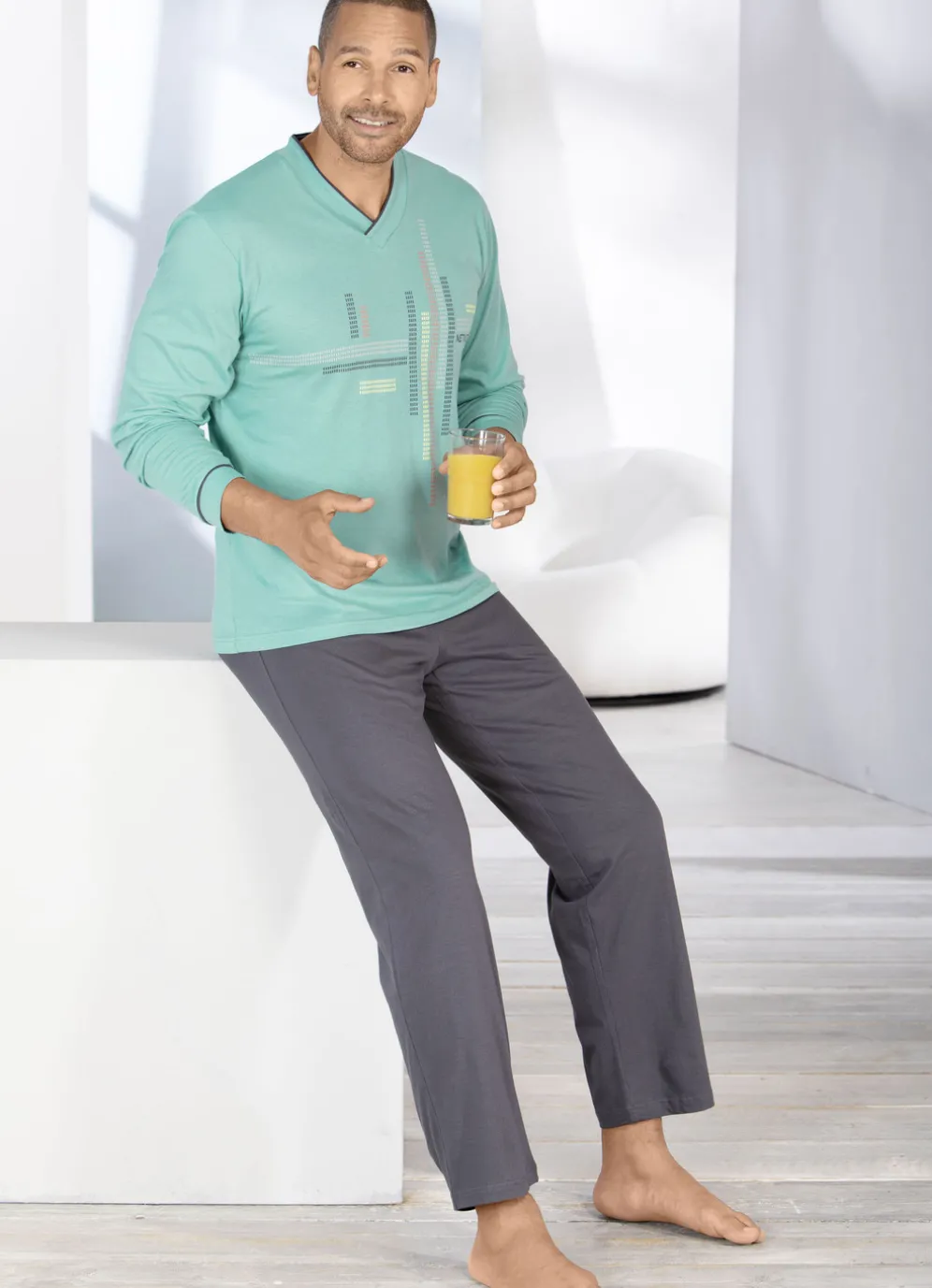 Schlafanzug in Türkis-Grafit: Oberteil mit V-Ausschnitt und platziertem Druckmotiv vorne. Lange Hose mit auswechselbarem Gummizug im Bund sowie offenen Beinabschlüssen.