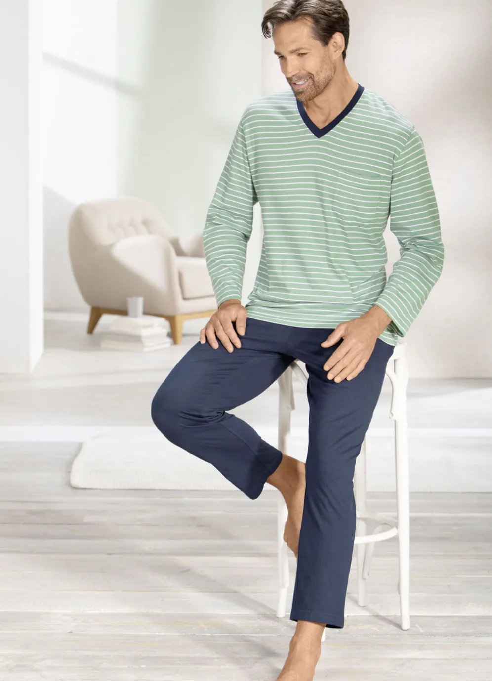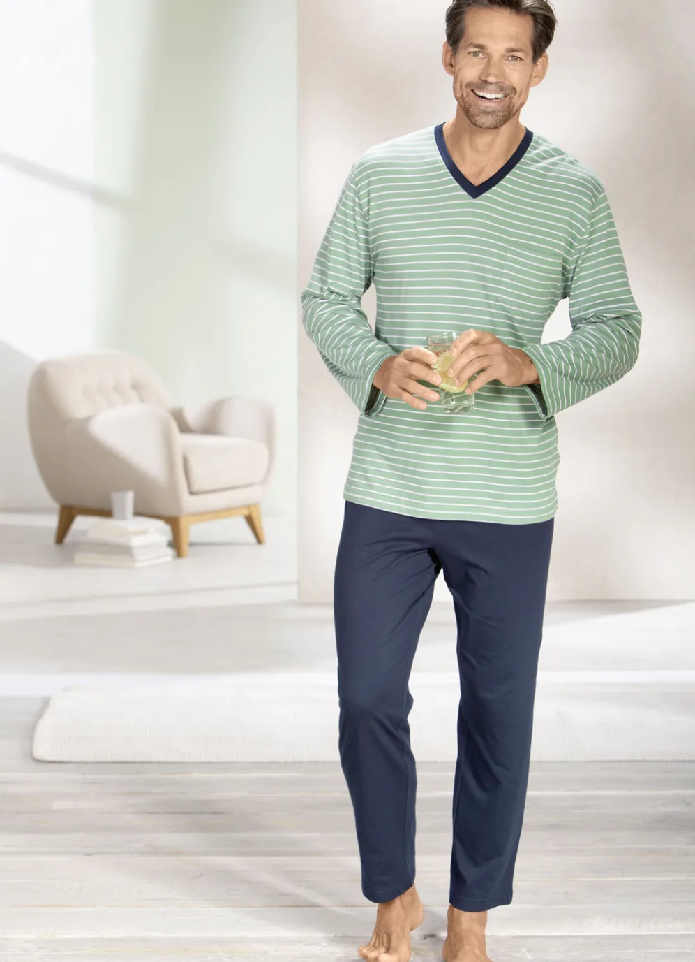 Für erholsame Nächte sorgt dieser Schlafanzug in Grün-Weiß-Marine. Das Oberteil mit V-Ausschnitt zeigt sich mit garngefärbtem Ringeldessin, aufgesetzter Brusttasche sowie innerem Rückensattel. Lange Hose in Marine mit auswechselbarem Gummizug im Bund und offenen Beinabschlüssen.