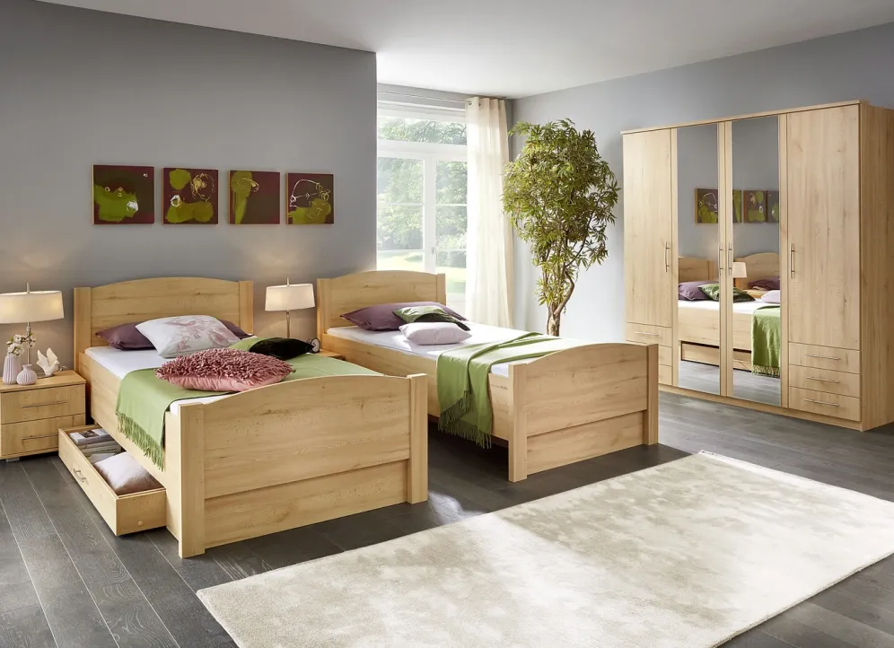 Komfortables, vorteilhaftes Wohnen: Schlafzimmerprogramm in Buche livorno, Weiß oder Eiche sonoma. Schubladen mit Metallführungsschienen. Mit Aufbau-Anleitung