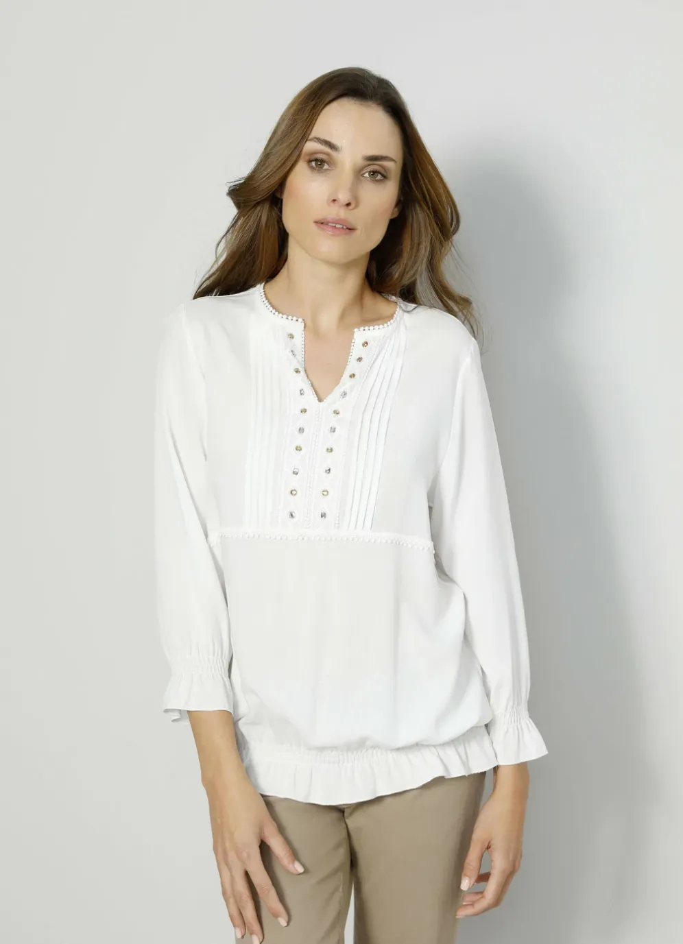 Bluse mit Rundhals und V-Ausschnitt. Darüber hinaus ist sie gerade geschnitten. Die 3/4-lange Ärmel sind mit einem Gummizug und Rüschen ausgestattet.