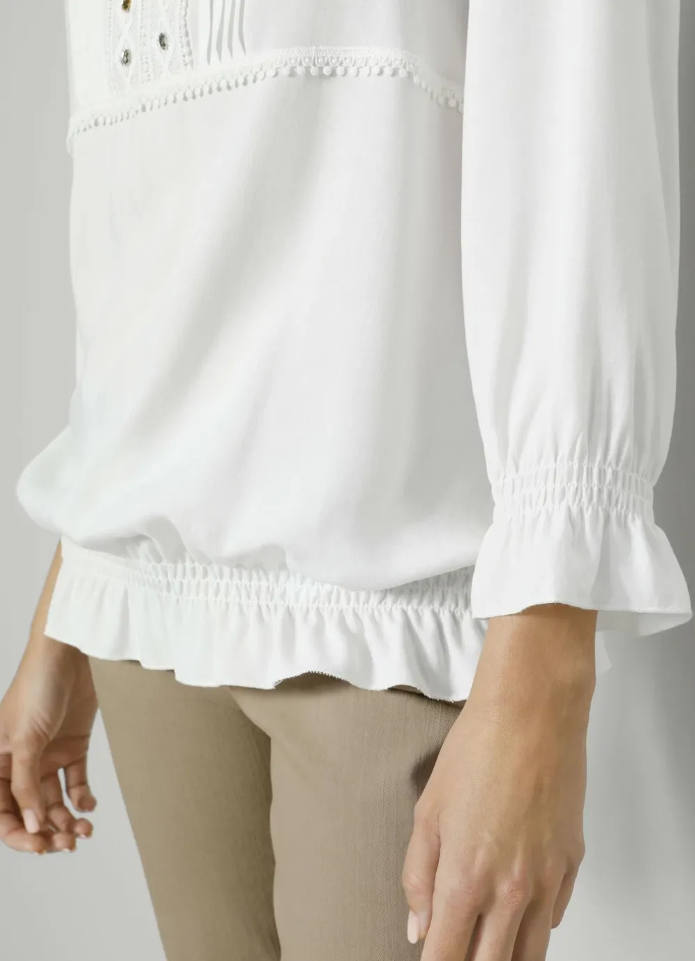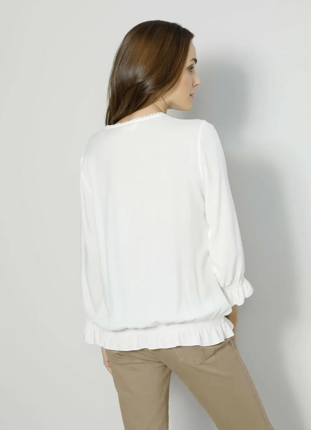 Schlupfbluse mit Rüschen in Weiss und in Größe 38.