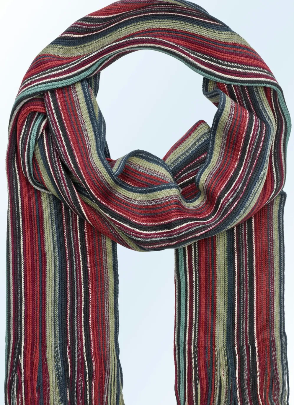 Schöner gestreifter Schal in Rotbraun-Petrol-Lila-Schwarz-Lindgrün Gestreift.