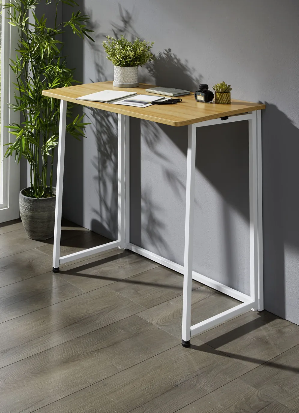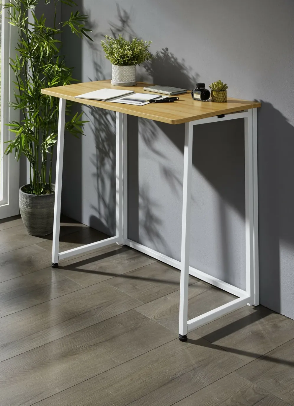 Klappbares RaumwunderI Ein mobiles Büro wird mit diesem klappbaren Schreibtisch ganz schnell Wirklichkeit. Dank seiner kompakten Konstruktion findet er auch in kleinen Räumen seinen Platz. Gestell aus Metall, Tischplatte aus MDF. Bei Nichtbenutzung kann er einfach platzsparend zusammengeklappt werden. Belastbar bis 100 kg.