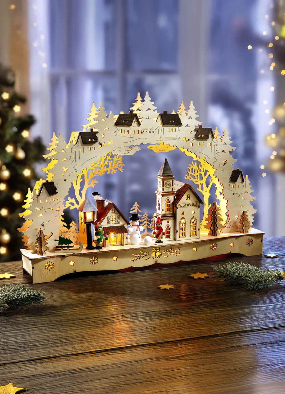 Dieser tolle Schwibbogen zaubert einfach eine wunderbare Atmosphäre in Ihr Zuhause! Er ist mit einer Kirche, spielenden Kindern, einem Schneemann, einer beleuchteten Laterne und einem Winterdorf ringsum schön geschmückt. Die integrierten 15 warm-weißen LEDs bringen das Ganze zum Strahlen. Batteriebetrieben mit 3x 1,5 Volt Mignon (jeweils nicht im Lieferumfang enthalten). Mit An-/Aus-Schalter. Maße: B43xH30xT8 cm