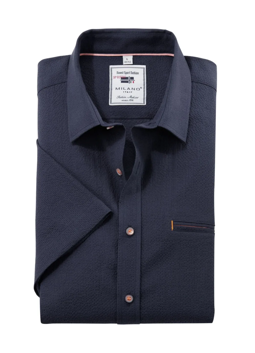 Schickes Hemd von „Milano Italy” mit Zierpaspel an der linken Vorderseite, Zierlabel am linken Ärmel sowie Rückenpasse mit Zierriegel.