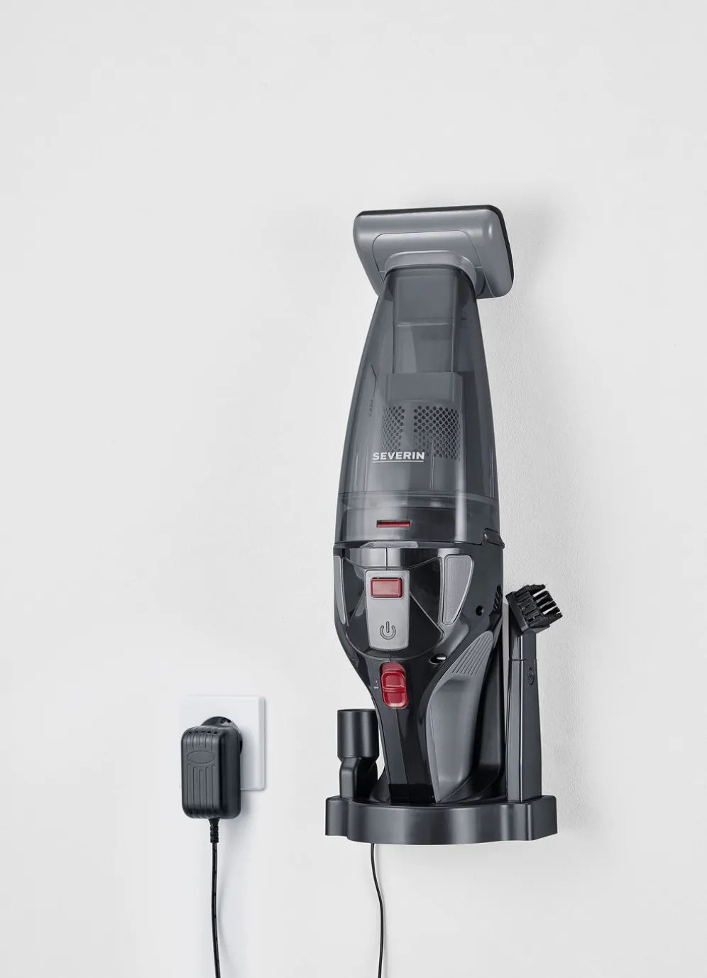Severin HV7147 2-in-1 Akku-Handstaubsauger in Grau-Rot-Schwarz.