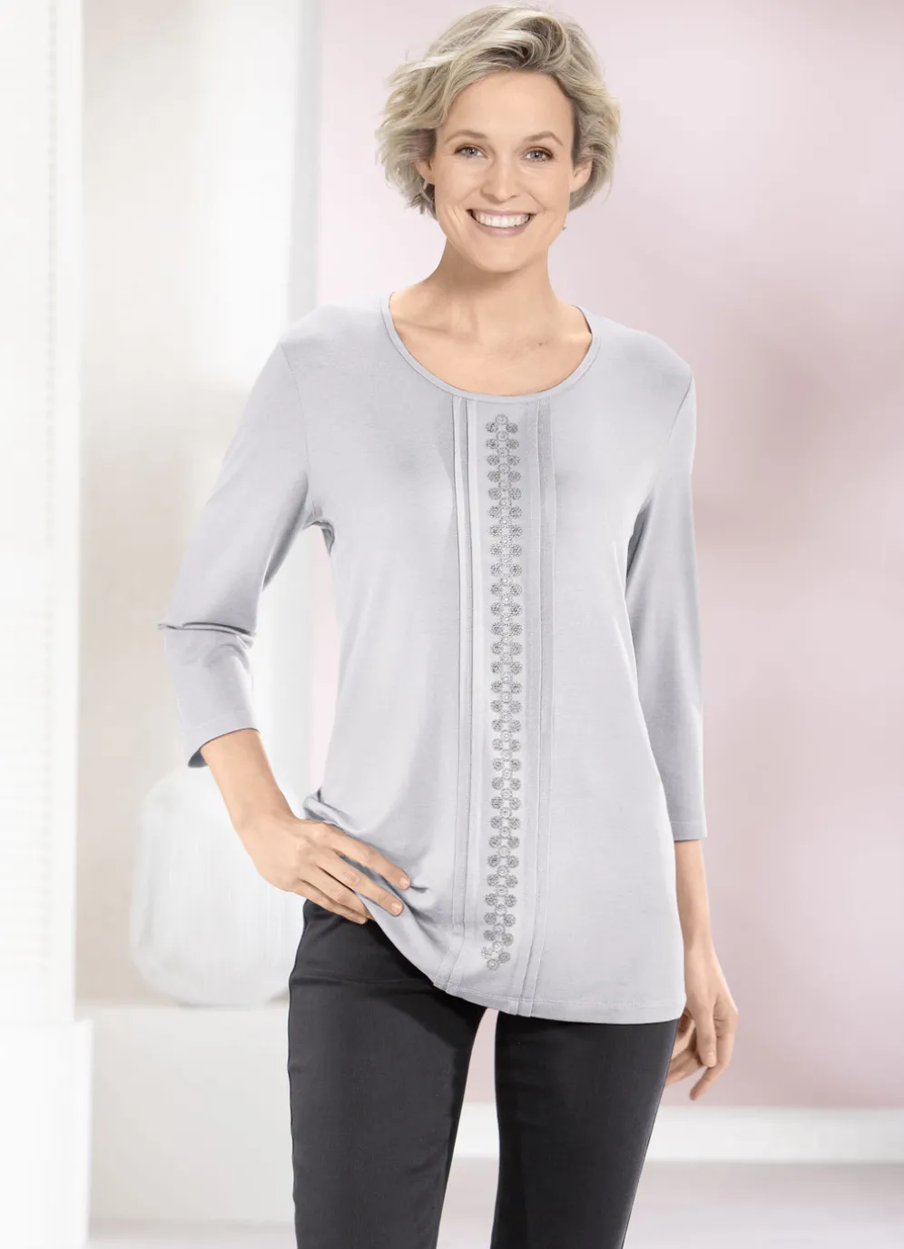 Ein echtes Glanzstück ist dieses extravagante Shirt mit Biesen, Zierplättchen und Strasszier im Vorderteil.