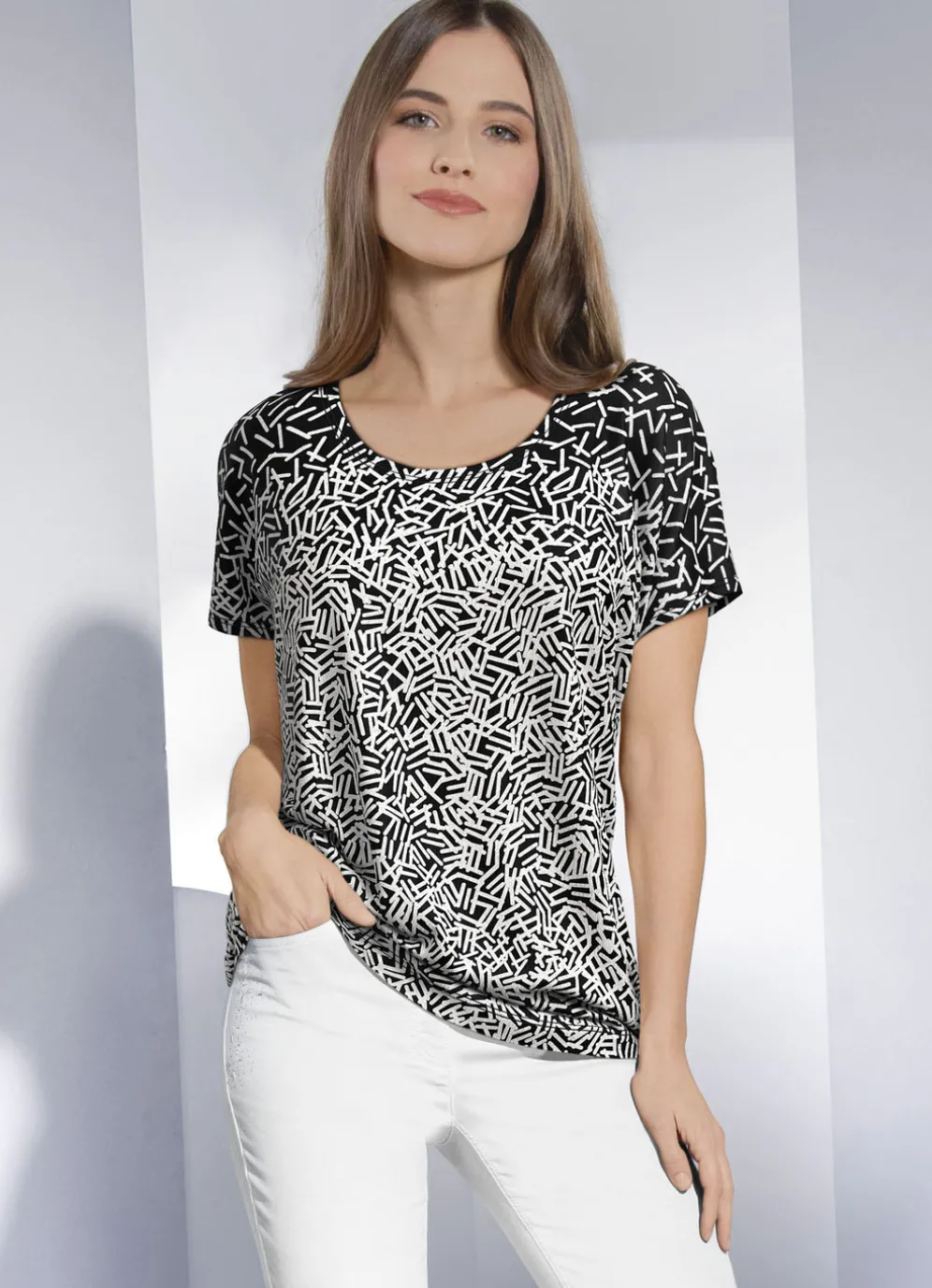 Jedes Teil ein Unikat! Schwarz-weißes Shirt mit farbbrillantem Alloverdruck, rundem Halsausschnitt, überschnittener Schulterpartie sowie leicht abgerundetem Saum.