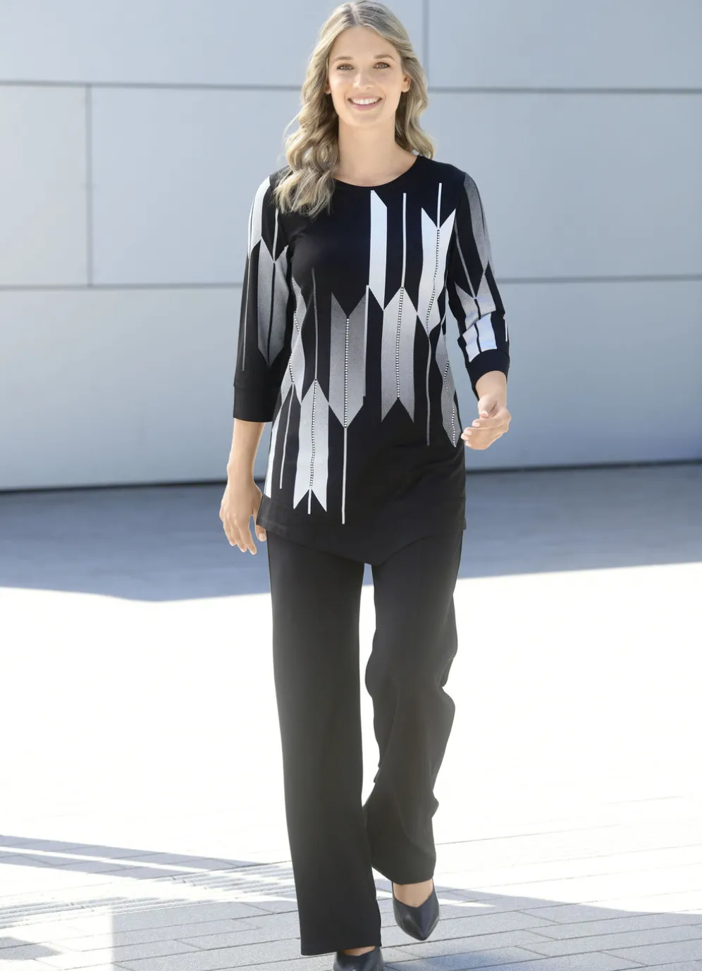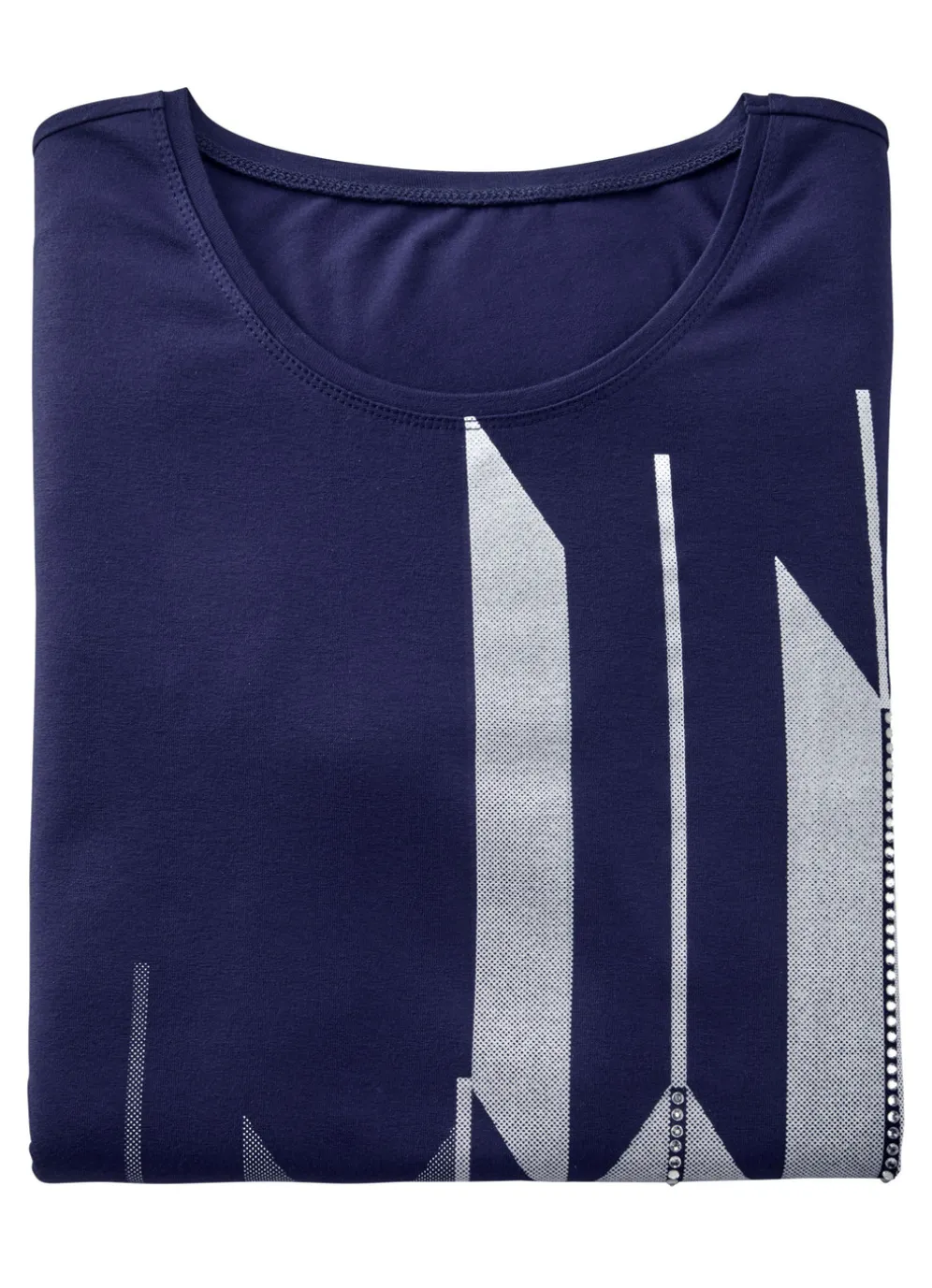 Ausgefallenes Shirt mit Kontrastdruck im strassverzierten Vorderteil und an den 3/4-langen Ärmeln mit Bündchenabschluss sowie angesetzter, spitz zulaufender Saumabschluss vorne.