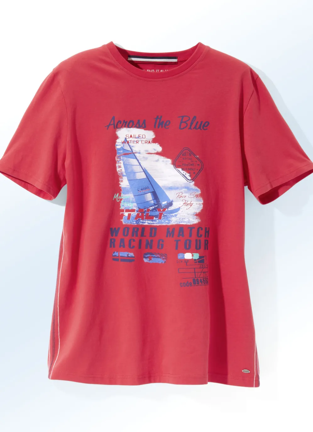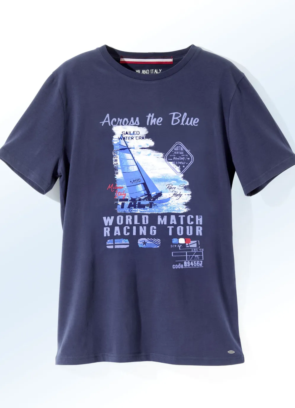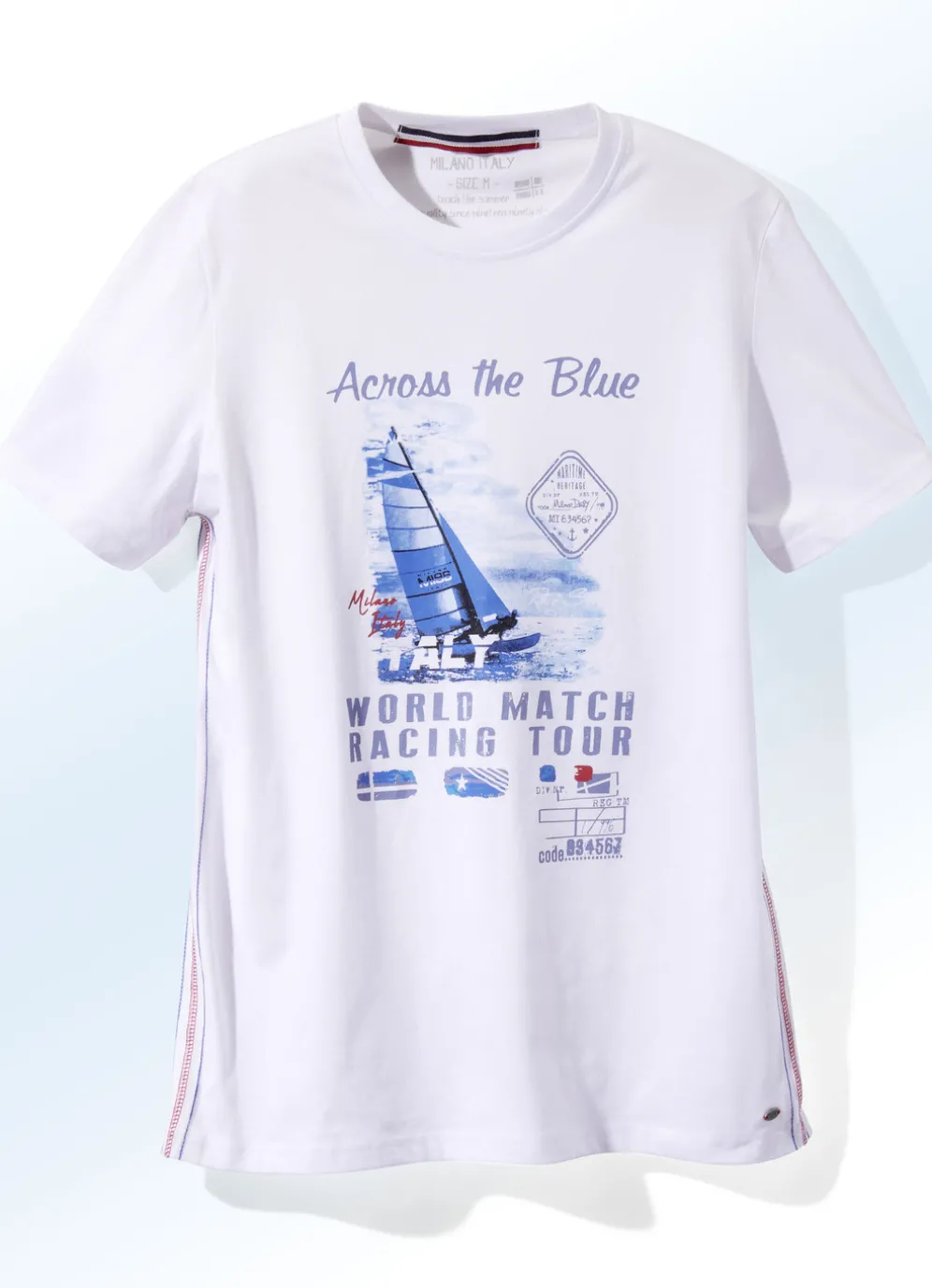 Sommerliches Shirt von „Milano Italy“, mit rundem Halsausschnitt, Druck im Vorderteil, seitlichen Kontrastnähten sowie Emblem am Saumabschluss links.