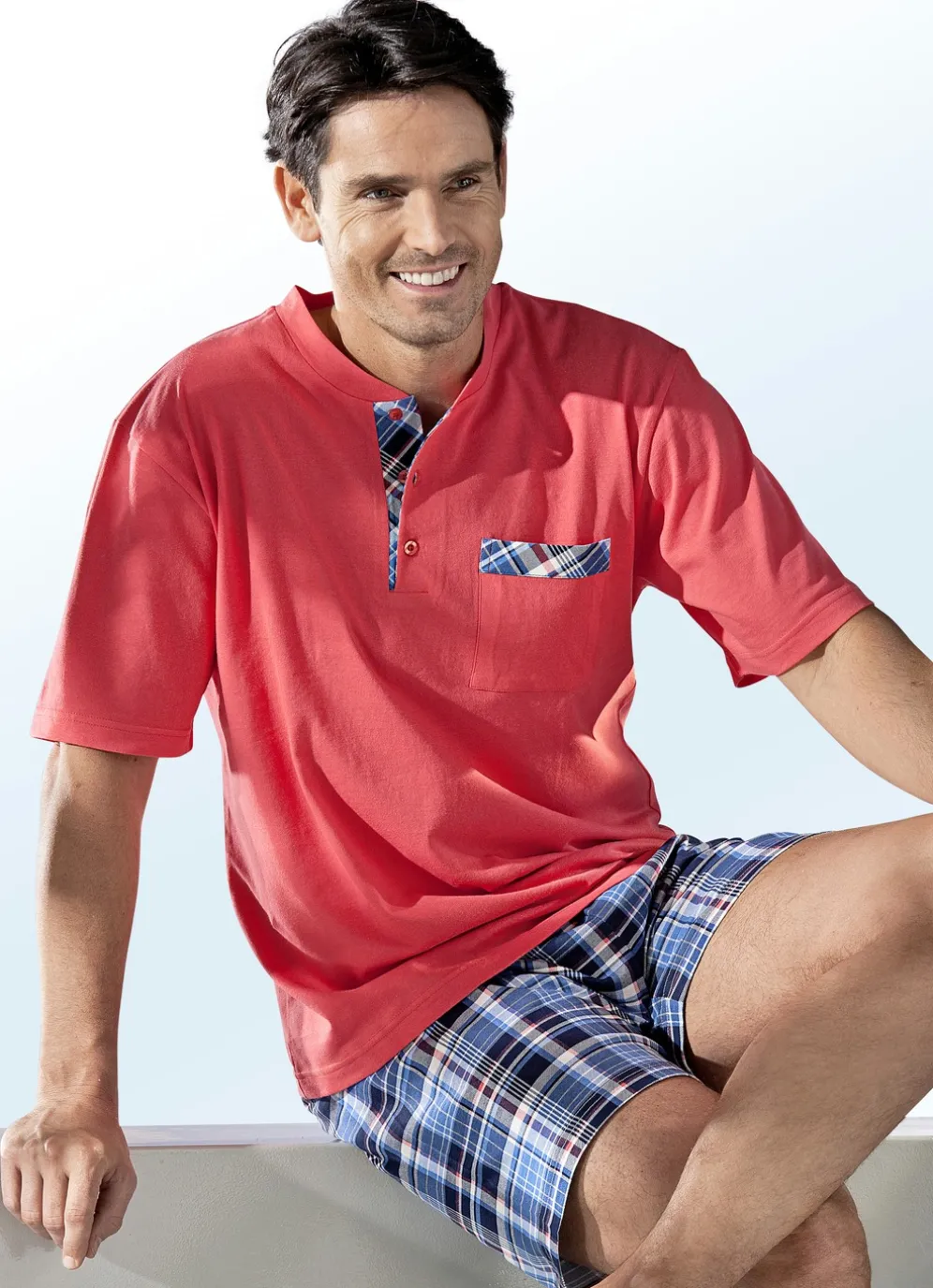 Ein Shorty mit modischem Anspruch: Das korallefarbene Oberteil ist mit Knopfleiste sowie aufgesetzter Brusttasche gearbeitet. Die Shorts mit blau-marine-buntem Karodessin sind mit auswechselbarem Gummizug im Bund ausgestattet.