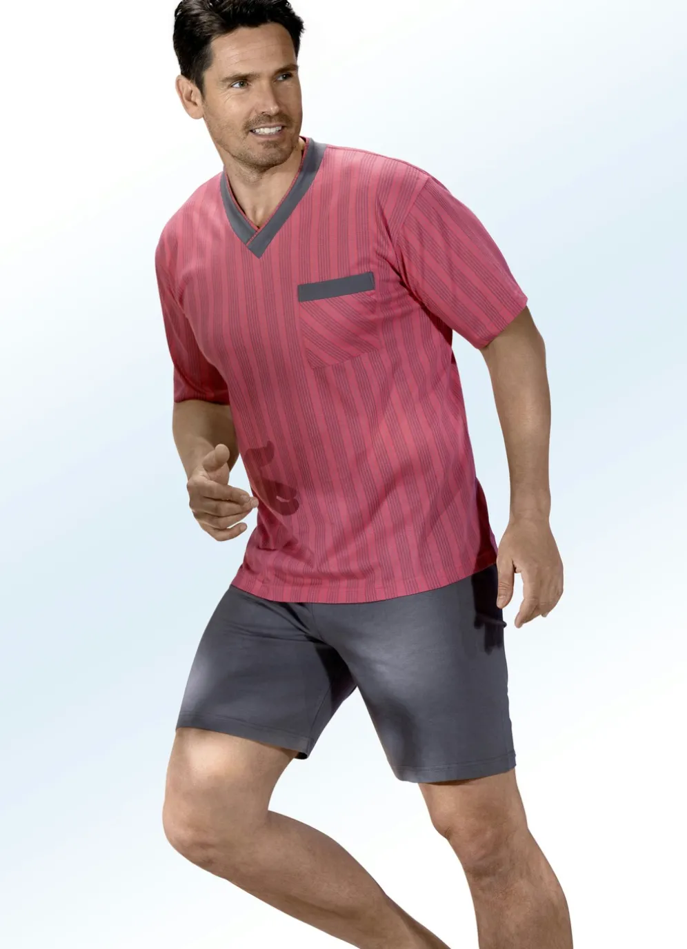 Pfiffiges Shorty in Koralle-Grafit: Oberteil mit V-Ausschnitt, Streifendessin und aufgesetzter Brusttasche. Shorts mit Dehnbund.