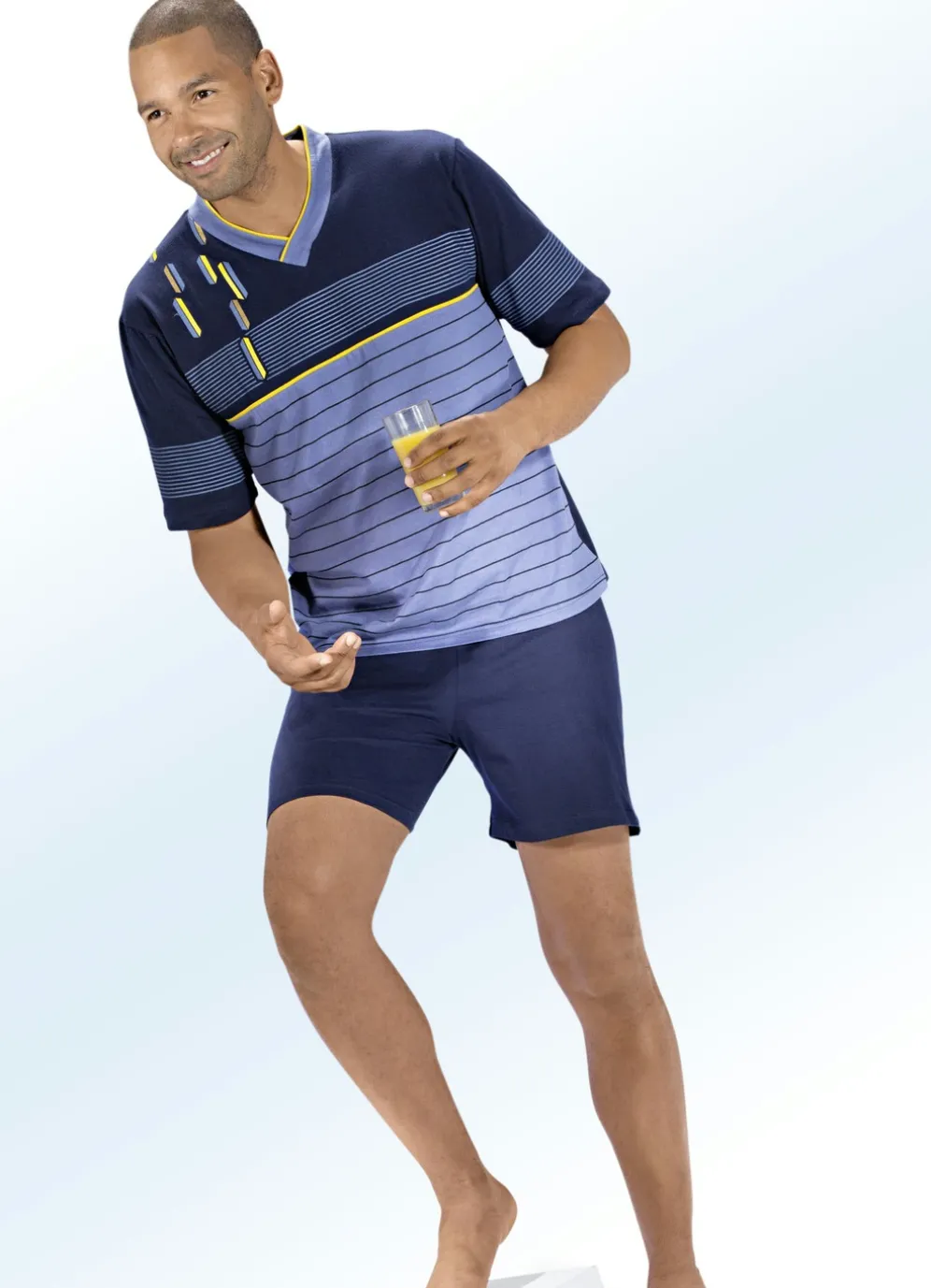 Modisches Shorty in Marine-Jeansblau-Gelb: Oberteil mit V-Ausschnitt, Kontrastpaspeln, Ringeldruck vorne und an den Ärmeln sowie hübschem Druckmotiv. Bequeme Shorts mit auswechselbarem Gummizug im Bund.
