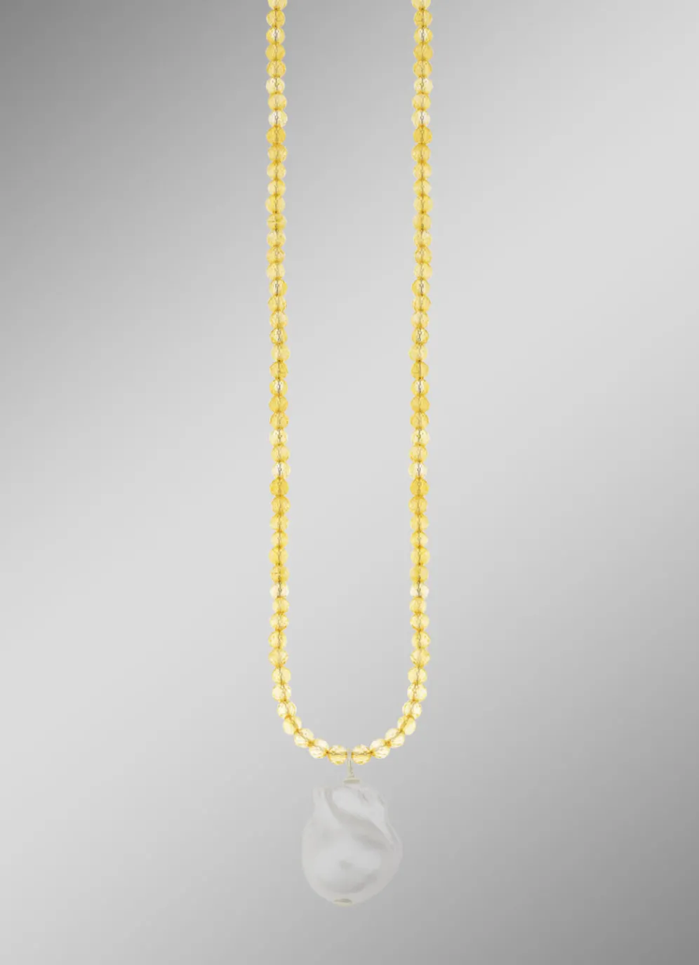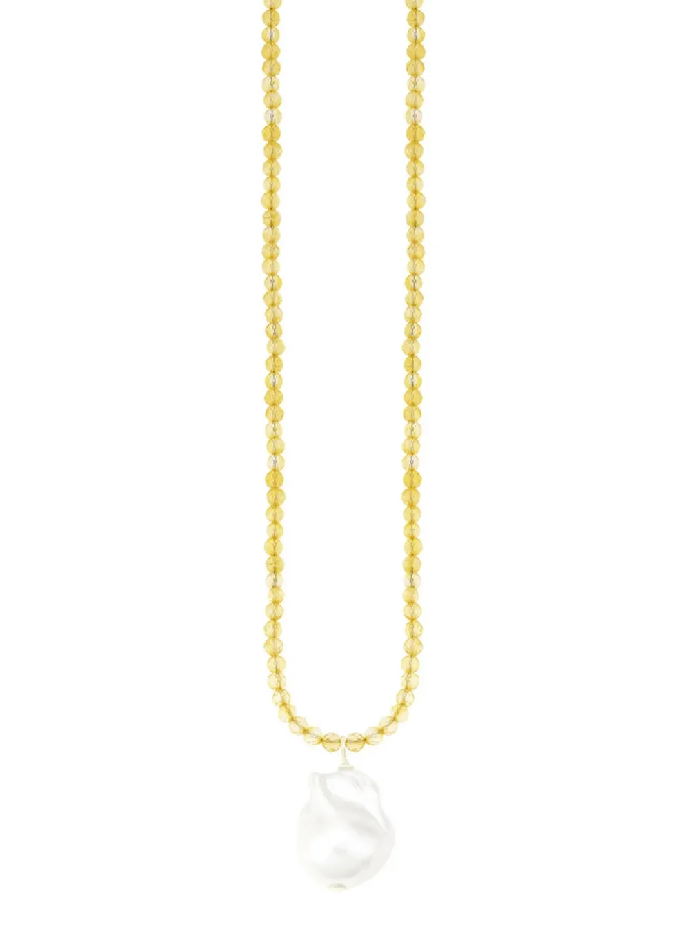 Die Kette besteht aus echten Citrin-Perlen mit einem Durchmesser von 3 mm und einer Barock-Perle als Anhänger (13-16 mm). Der praktische Karabinerverschluss sorgt für sicheren Halt.