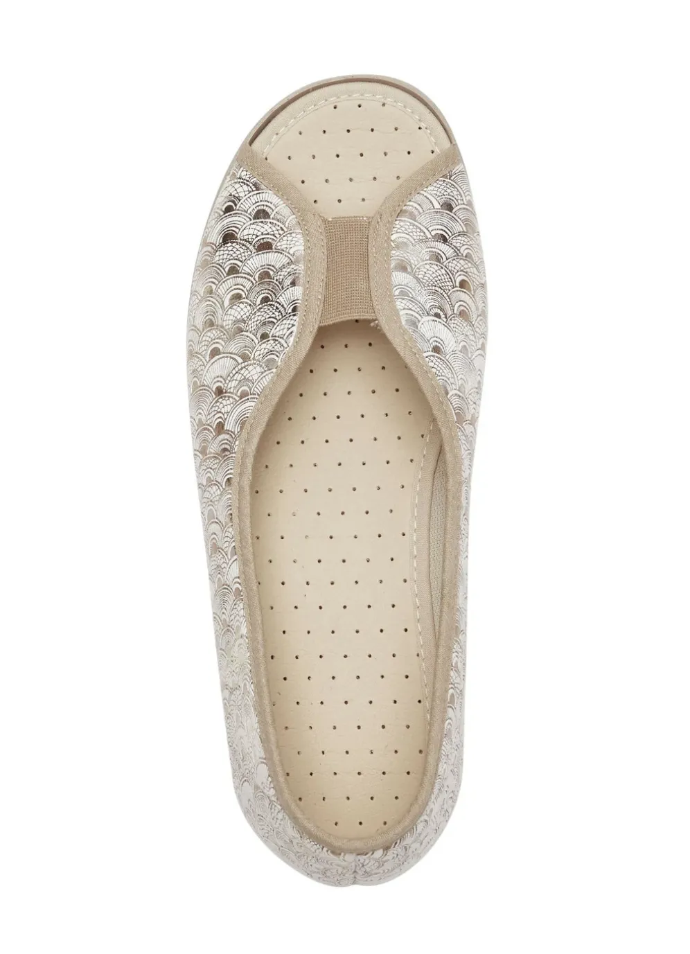 Slipper in Goldbeige aus elastischem, gepolstertem Textilmaterial, glänzend bedruckt: in Weite H, Gummizug, Textilfutter, gepolsterte Decksohle, leichte Gummi-Laufsohle sowie 20 mm Keilabsatz