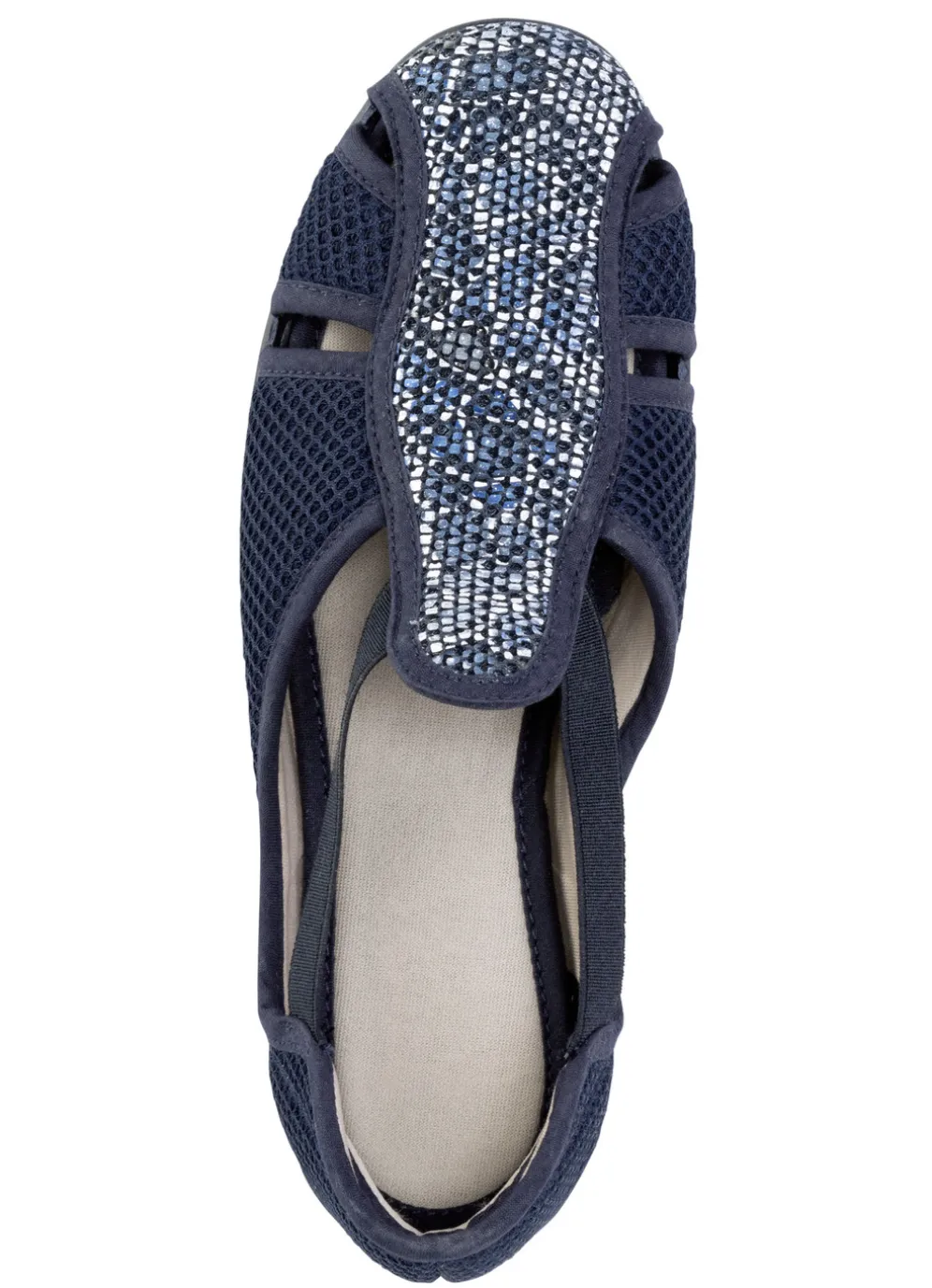 Luftig durchbrochener Slipper aus gepolstertem, teilweise schimmernd bedrucktem Textilmaterial, mit Elastik-Bandagen: Textilfutter, gepolsterte Decksohle, leichte Gummi-Riffelsohle sowie 25 mm Keilabsatz