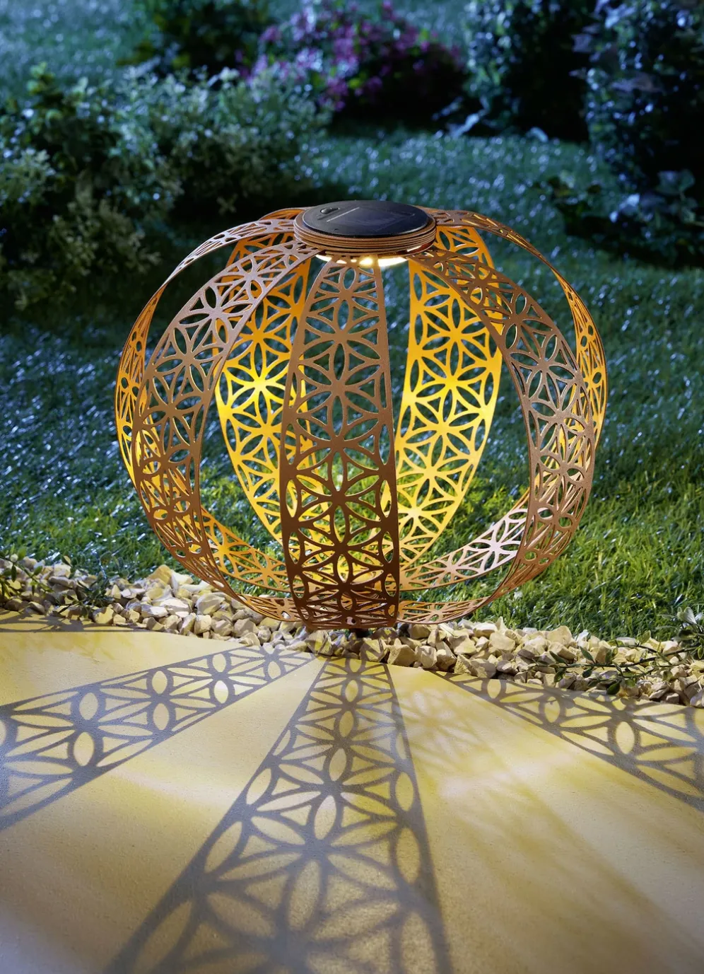 Diese kugelförmige Solarleuchte aus rostfarbenem Metall ist eine wundervolle Ergänzung für Ihren Garten. Sie wird mit Hilfe des Erdspieß unkompliziert und flexibel einfach in den Erdboden oder den Blumenkasten gesteckt. Die Dekorstanzungen erzeugen bei Dunkelheit interessante Schattenspiele.