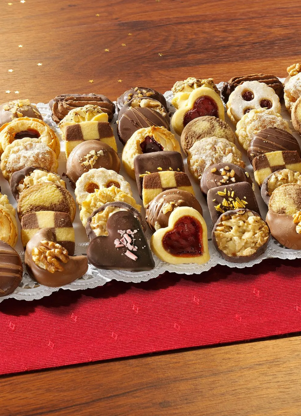 Abwechslungsreiche Gebäckkreationen aus alter Familienrezeptur. Butter-Nougatcrememuschel, Walnussmonde, Schwarz-Weiß-Gebäck, Bärentatzen, Fruchttaler, Ochsenaugen, Orangen-Marzipan-Karree, Pfauenaugen, Waldfruchttaler, Knuspergebäck, Fruchtherz, Kakaozungen, Karamellherzen, Apfeltaler, Vanille-Creme-Törtchen, Aprikosentatzen. Ein Meisterwerk der Konditorenkunst und eine einzigartige Geschmacksvielfalt für besondere Anlässe. Inhalt: 500 g