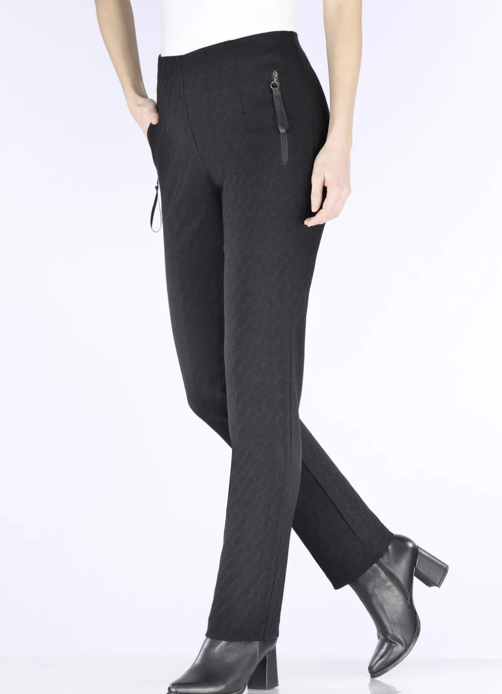 Sportive Hose in Schwarz, mit angeschnittenem Bund, glatt anliegend dank der innenliegenden Gummibund-Einlage, figurformende Abnäher unterhalb des Bundes rundum sowie Seitentaschen mit Reißverschluss und Zieranhänger. Innenbeinlänge ca. 78 cm, Fußweite ab 36 cm.