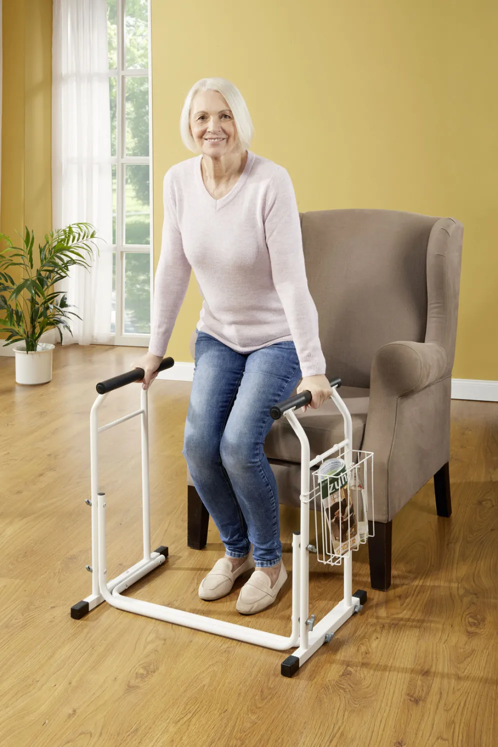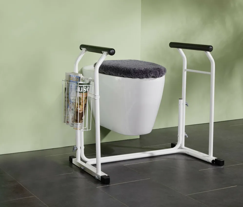 Ein praktisches Hilfsmittel in Bad und WC, sowie Schlaf- und Wohnzimmer für Personen, die sich aufstützen müssen oder in Ihrer Beweglichkeit eingeschränkt sind. Das robuste Material sorgt für einen sicheren Halt. In der seitlich befindlichen Ablage (Einhängekorb) können z.B. Magazine oder Zeitungen aufbewahrt werden. Max. Belastung der beiden Griffgeländer 75 kg. Super stabil. Leichte Montage ohne Bohren. Maße: ca. B72xH66,5xT50 cm