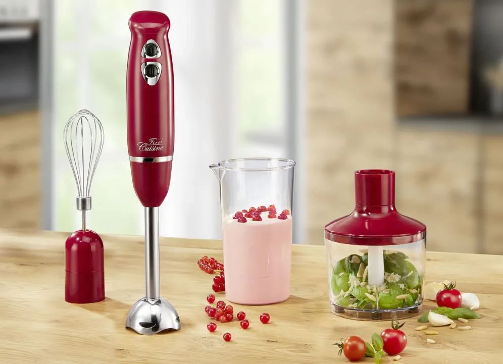 Stabmixer-Set mit 2-flügeligem Edelstahlmesser in Rot.