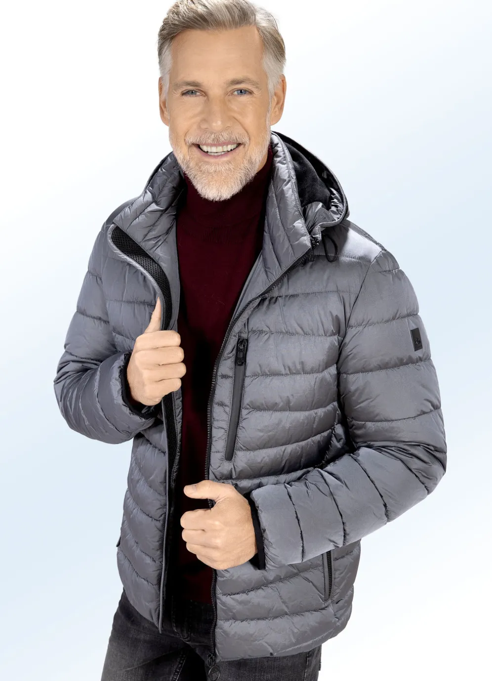 Markante „New Canadian“-Steppkurzjacke in Grafit: Steh-Umlegekragen, abtrennbare Kapuze mit Fleecebesatz, perforierter Einsatz und Durchzugsband mit Stopper, durchgehender Reißverschluss, eine Reißverschluss-Brusttasche links, zwei Reißverschluss-Taschen, elastischer Ärmelbund, Emblem am linken Ärmel sowie zwei Innentaschen.