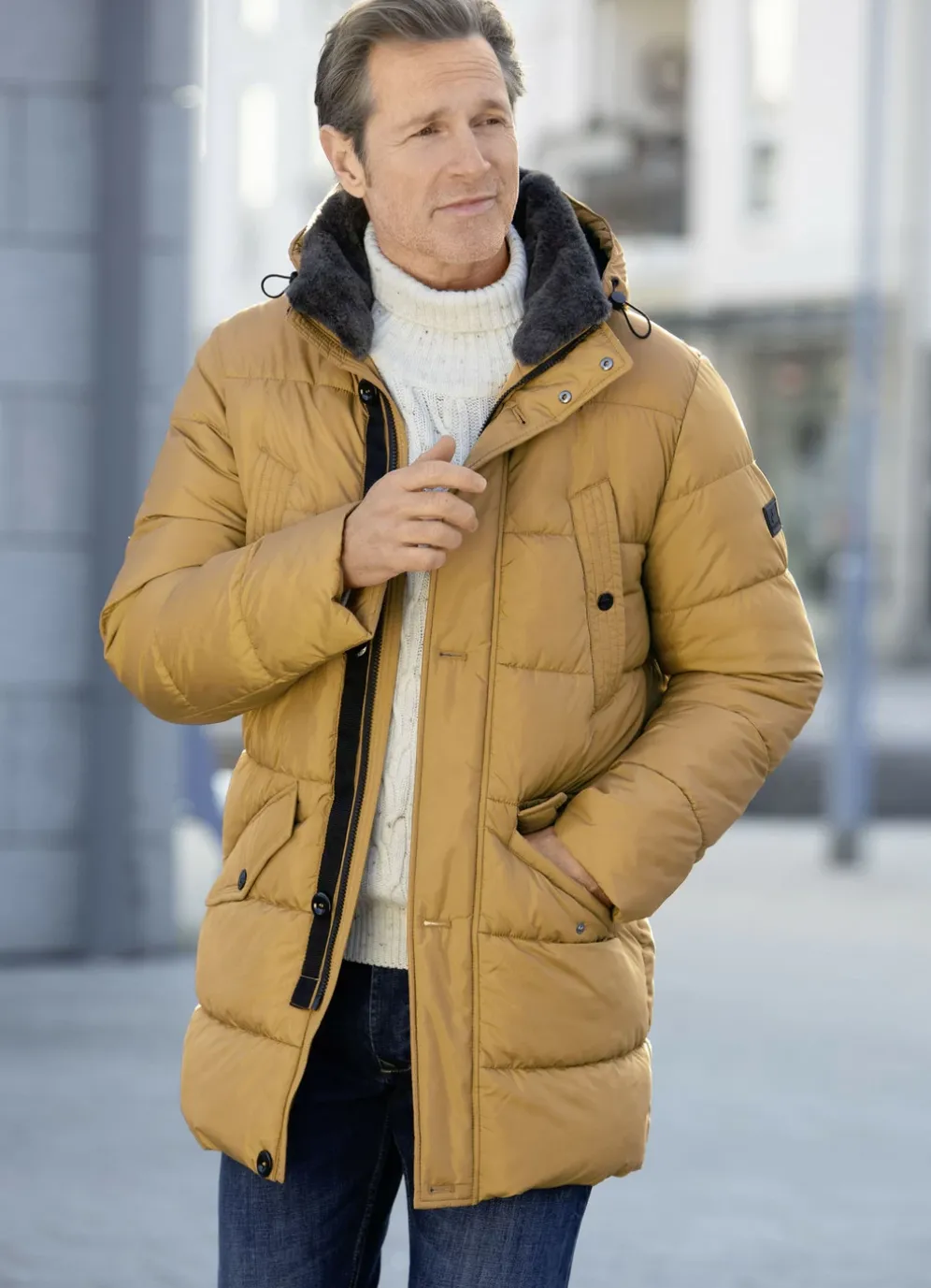 Topmoderner „New Canadian“-Steppparka in Messing: mit abtrennbarem Webpelzbesatz am Kragen, kontrastgefütterter abtrennbarer Kapuze mit Durchzugsband und Stopper, verdecktem Reißverschluss unter der Knopfleiste, Emblem am linken Ärmel, seitlichen Brusttaschen mit Drucker, zwei Pattentaschen mit Drucker sowie zwei Reißverschluss-Innentaschen.